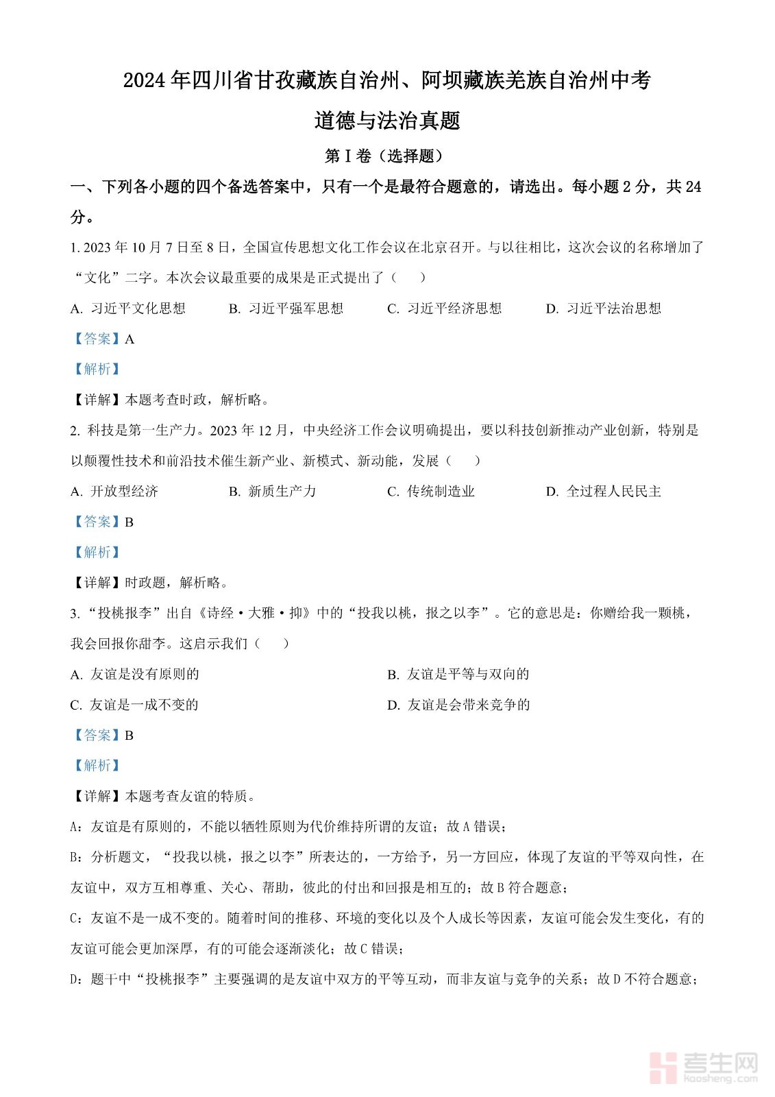 2024年四川省甘孜藏族自治州、阿坝藏族羌族自治州中考道德与法治真题(解析版)