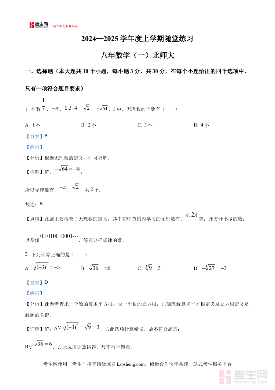 该资料通过对随堂联考试卷的系统解析,帮助使用者明确考试的考查方向与自身知识掌握的薄弱环节,可用于日常学习中的学情诊断、阶段性学习效果评估,以及后续备考计划的合理调整,助力使用者针对性提升数学学习的效率与质量。