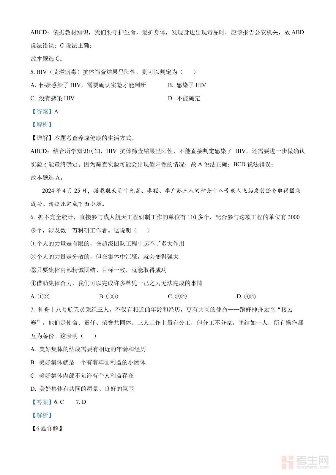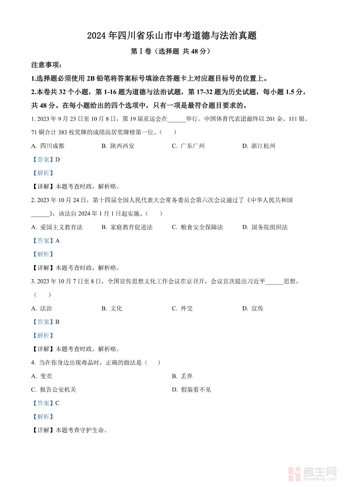2024年四川省乐山市中考道德与法治真题(解析版)