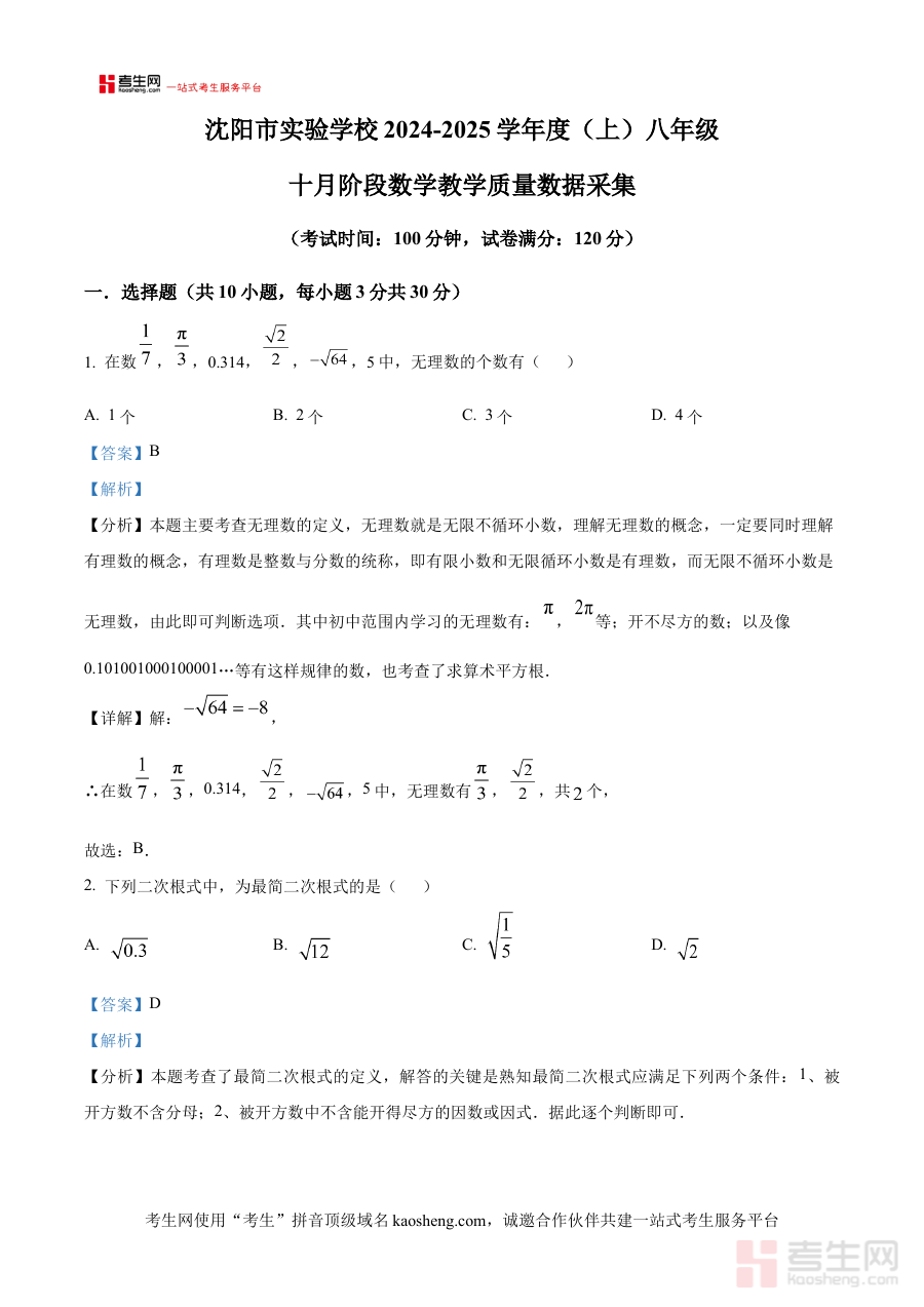 《精品解析:辽宁省沈阳市沈河区2024-2025学年八年级上学期10月阶段教学质量数据采集数学试卷(解析版)》是针对辽宁省沈阳市沈河区2024-2025学年八年级上学期10月阶段教学质量数据采集数学考试的配套备考资料,精准匹配该区域该学段特定时间节点的教学质量检测场景,为使用者提供与本次考试直接相关的解析类内容支持。