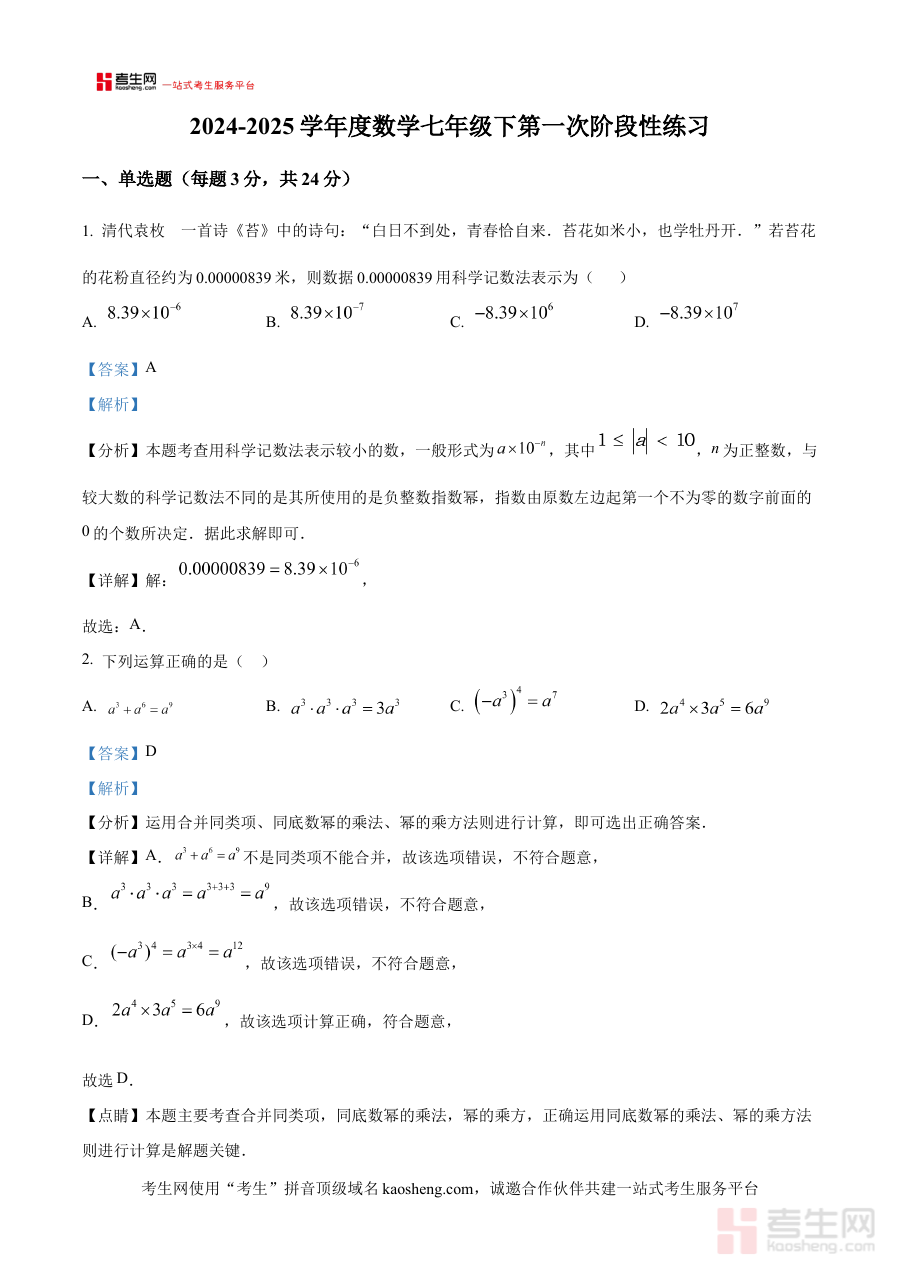 《精品解析:陕西省西安市灞桥区2024-2025学年下学期第一次月考七年级数学试题(解析版)》是面向陕西省西安市灞桥区2024至2025学年下学期七年级学生及数学教师推出的针对性备考资料。该资料紧密结合本地区该学年下学期初期数学学科的教学进度与第一次月考的命题导向,通过对试题的系统解析为使用者提供与本次阶段性检测直接相关的专业资源,助力使用者快速把握考试核心内容与考查方向,为备考工作提供清晰指引。