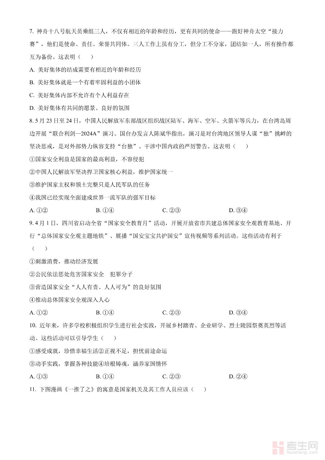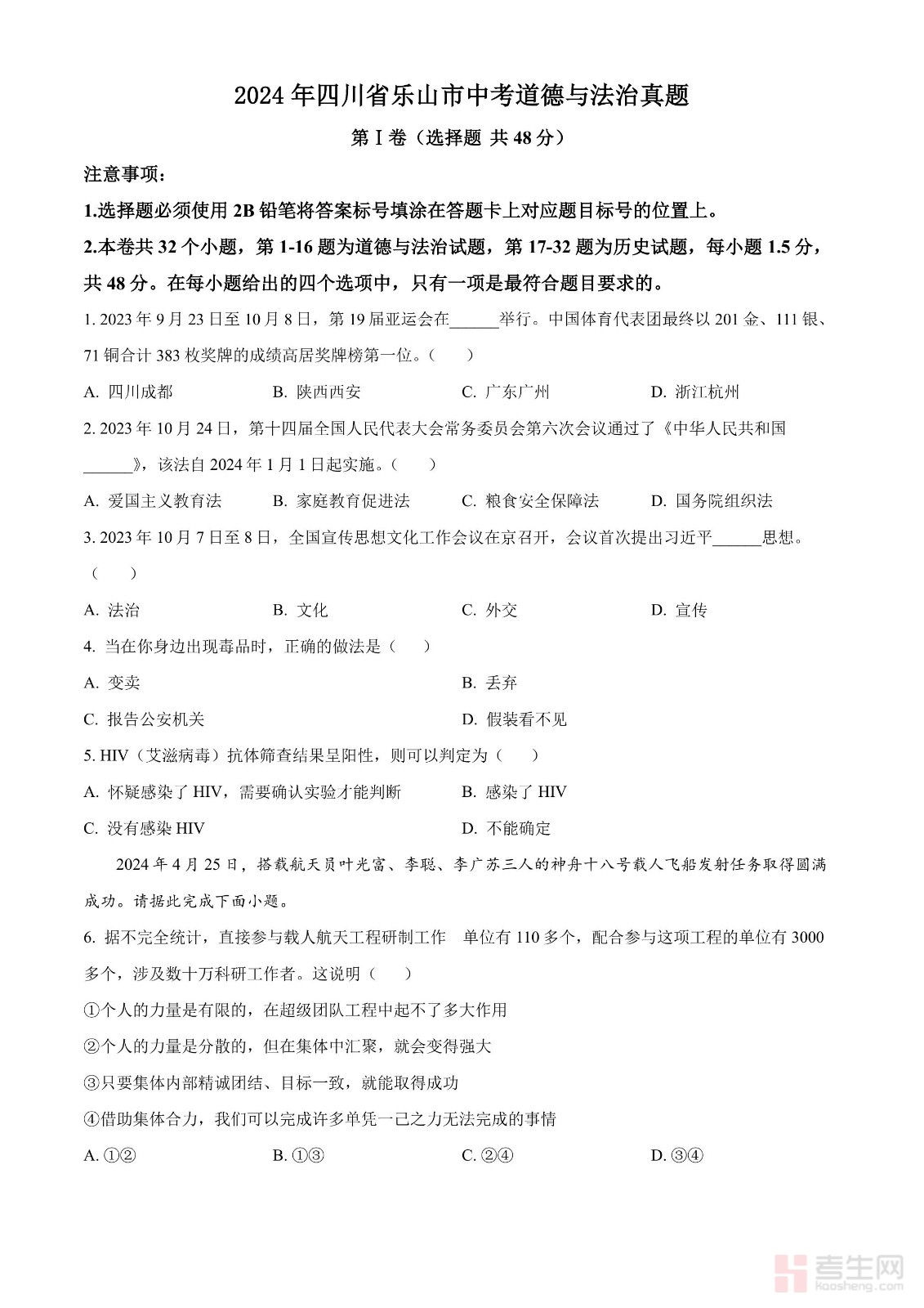 2024年四川省乐山市中考道德与法治真题(原卷版)