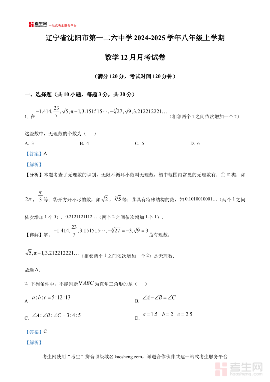 《精品解析:辽宁省沈阳市第一二六中学2024-2025学年八年级上学期数学12月月考试卷(解析版)》是针对辽宁省沈阳市第一二六中学特定学年学期数学学科月度考试的专业备考资料,聚焦该中学八年级学生在2024-2025学年上学期12月阶段的数学学习成果检测需求,为使用者提供与该校本次月考直接相关的系统解析支持,是贴合该校教学进度与考查要求的针对性资料。
