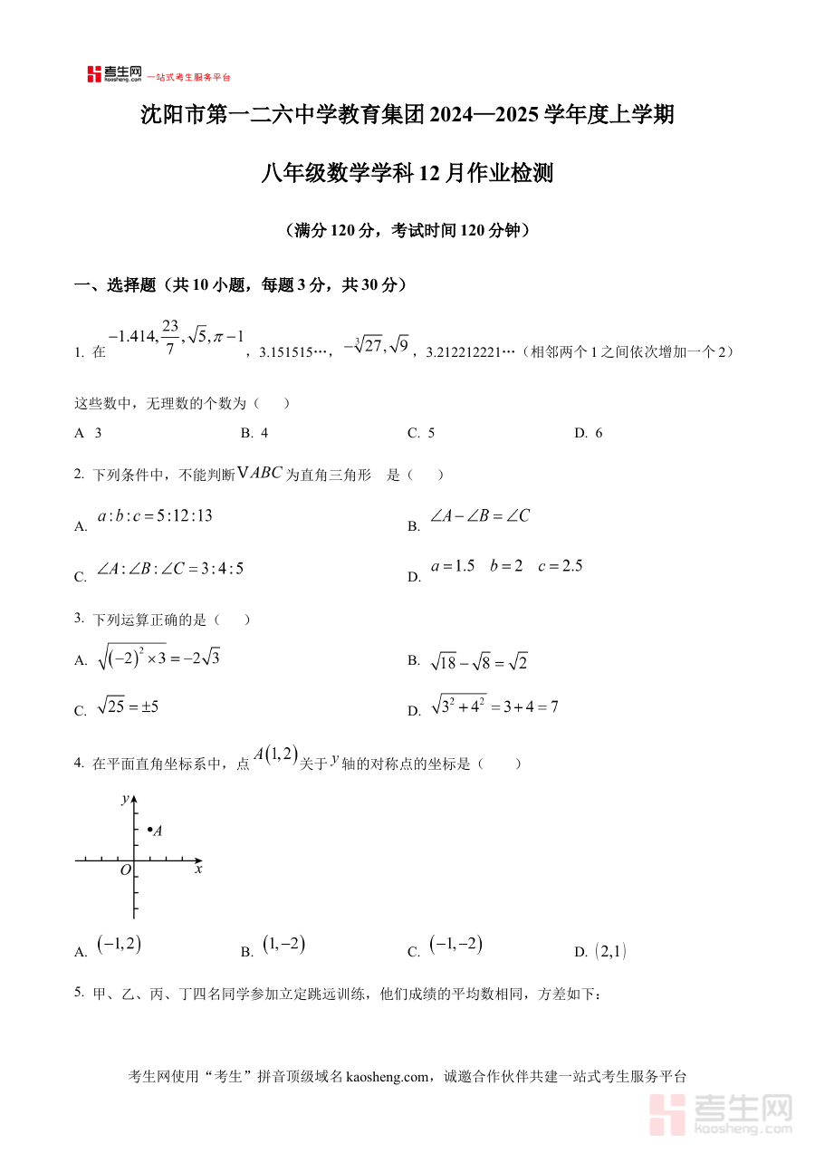 《精品解析:辽宁省沈阳市第一二六中学教育集团2024-2025学年上学期12月作业检测八年级数学试题(原卷版)》是针对辽宁省沈阳市第一二六中学教育集团在2024-2025学年上学期12月组织的八年级数学作业检测所编制的备考资料,包含该次作业检测的原卷内容,为相关教学与学习活动提供直接参考依据。