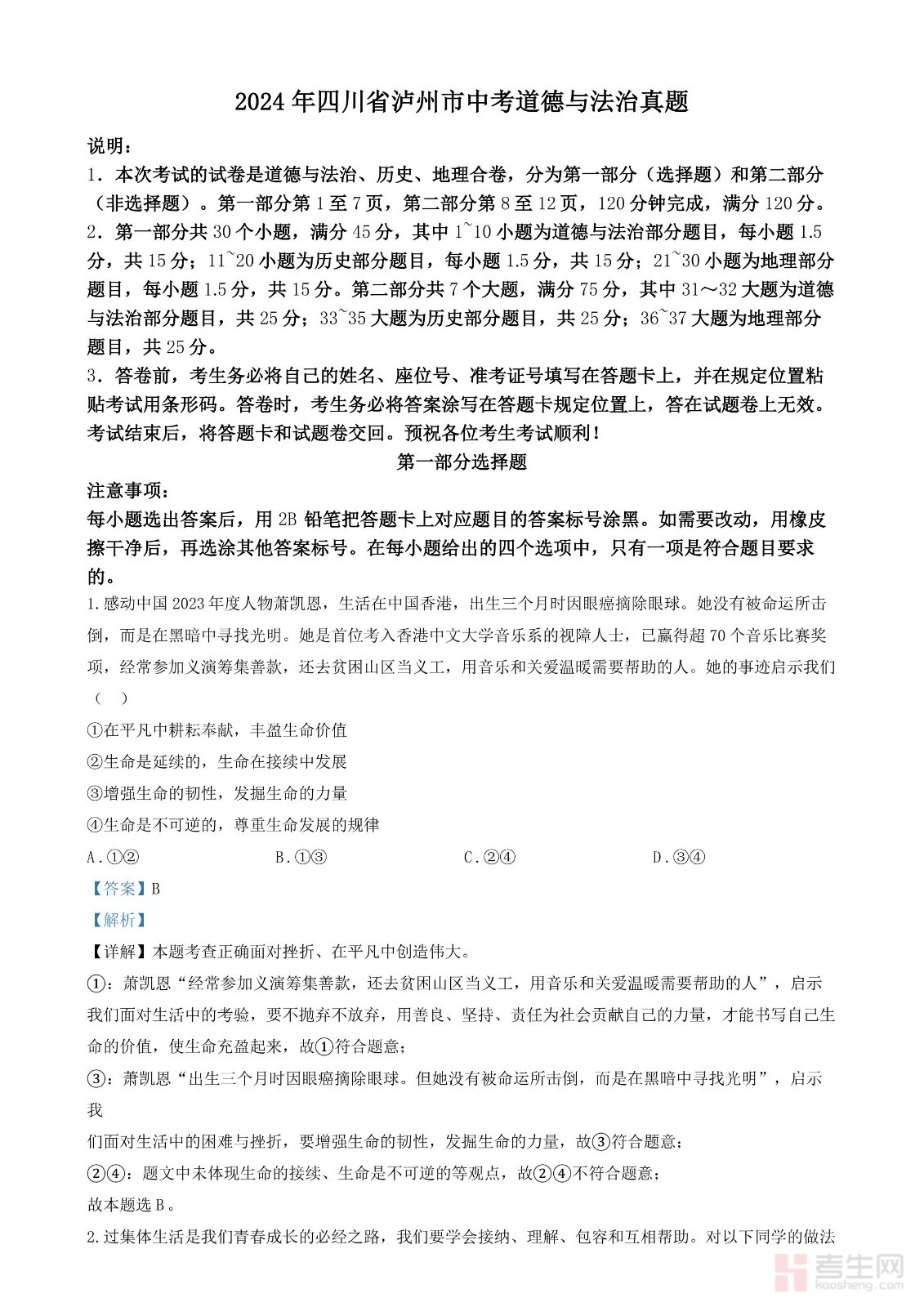 2024年四川省泸州市中考道德与法治真题(解析版)