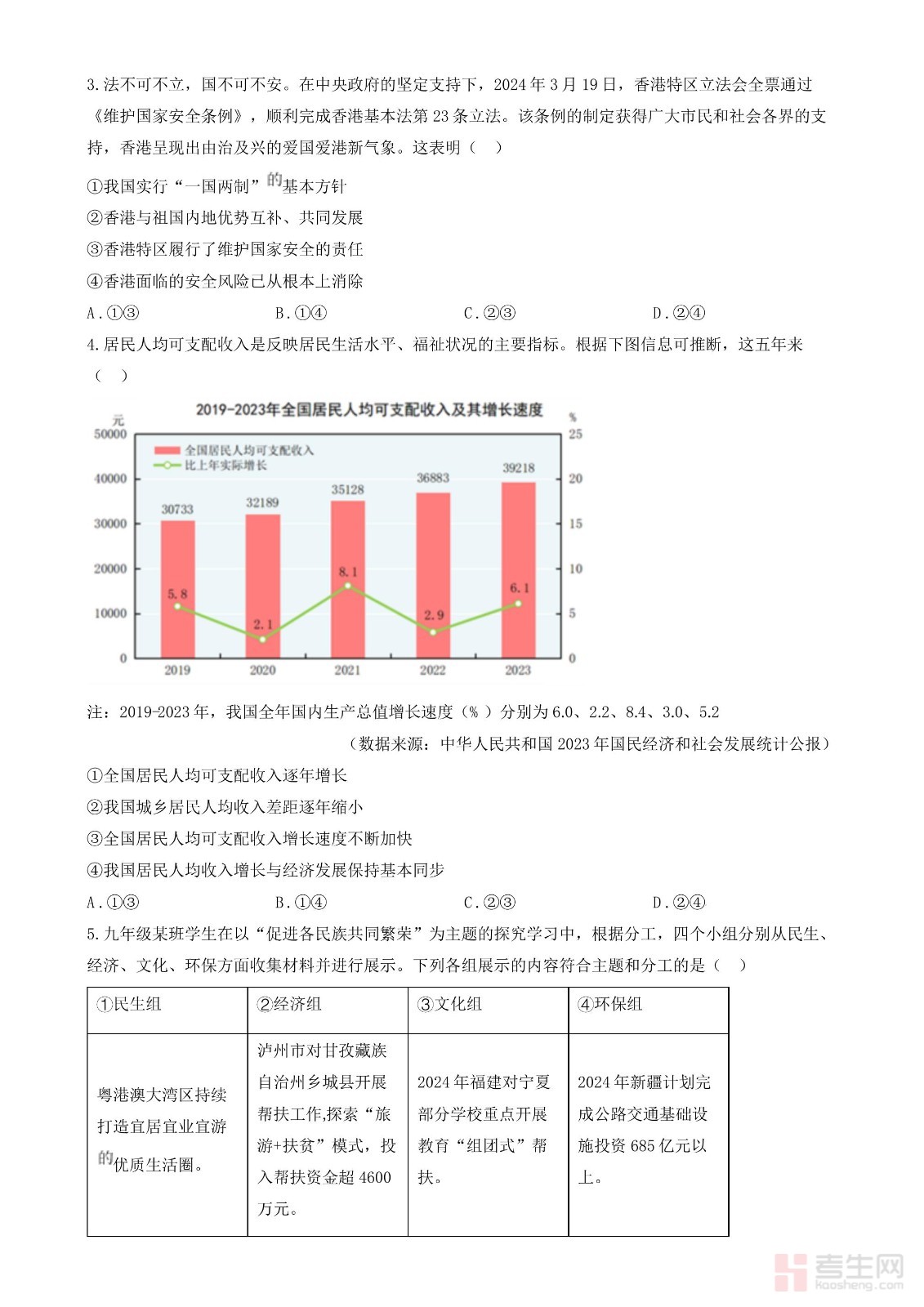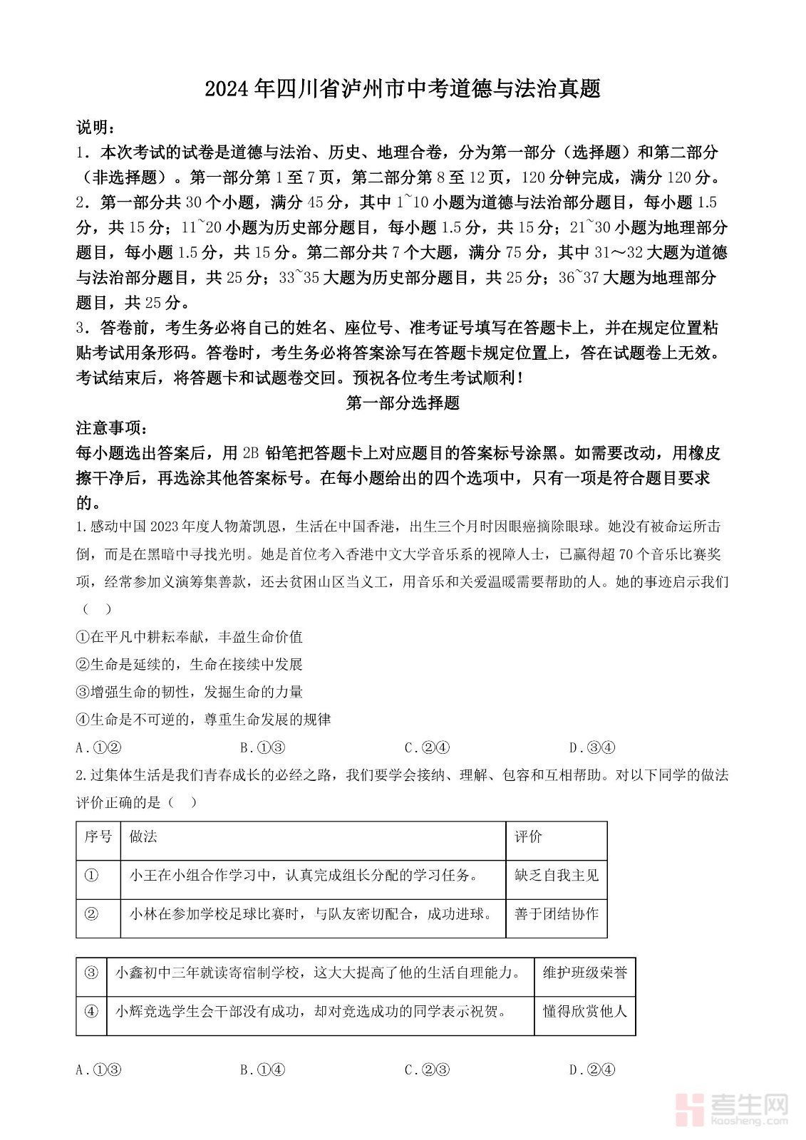 2024年四川省泸州市中考道德与法治真题(原卷版)