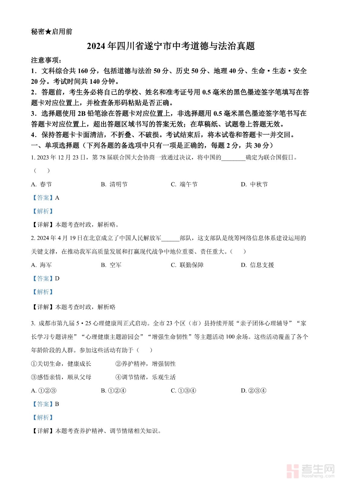 2024年四川省遂宁市中考道德与法治真题(解析版)
