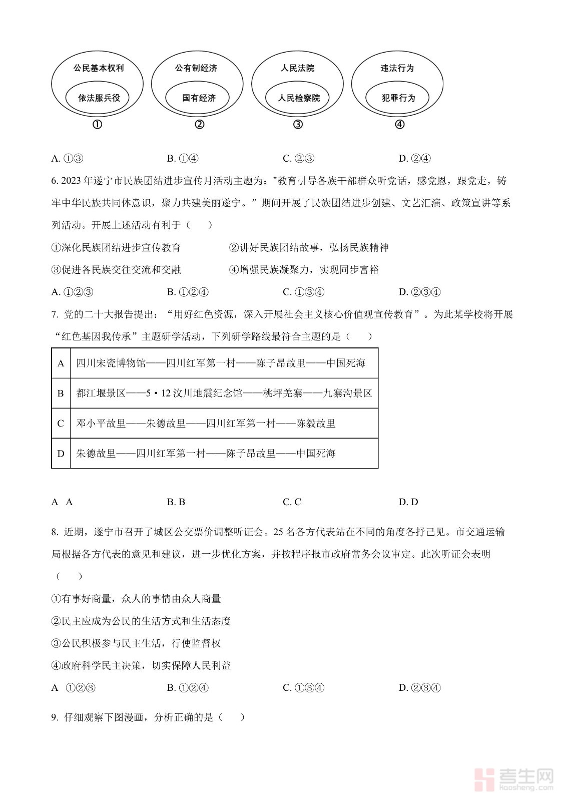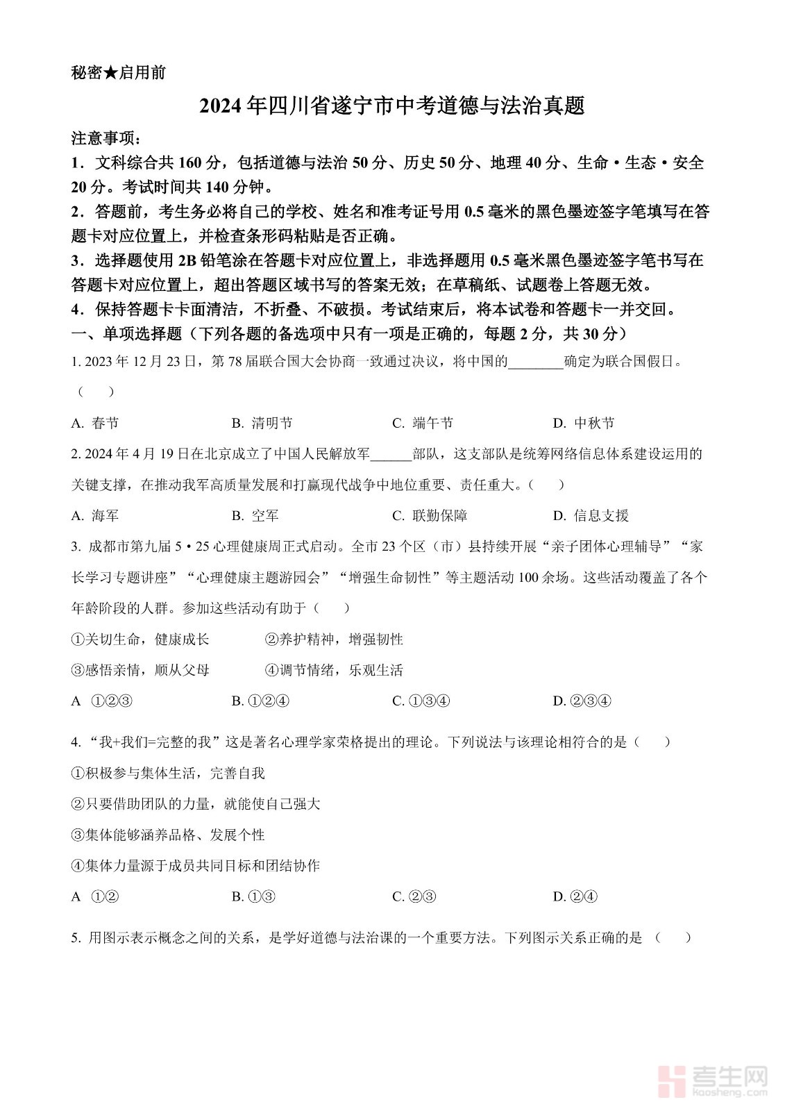 2024年四川省遂宁市中考道德与法治真题(原卷版)