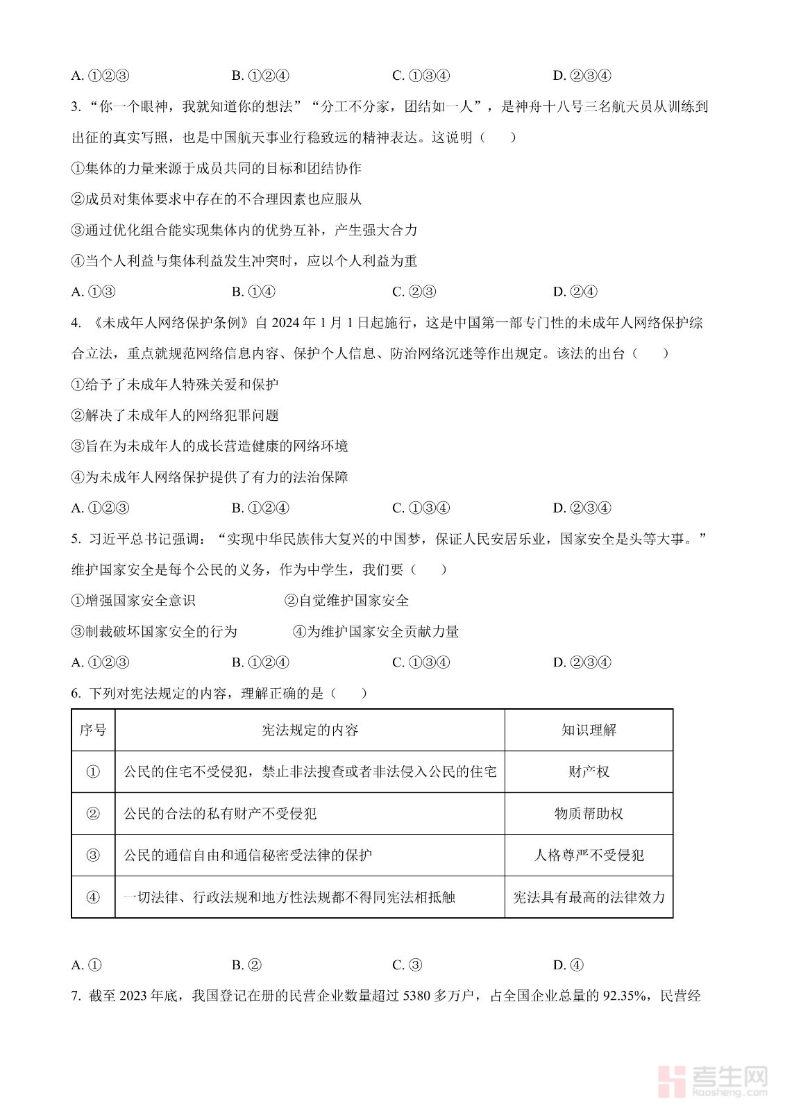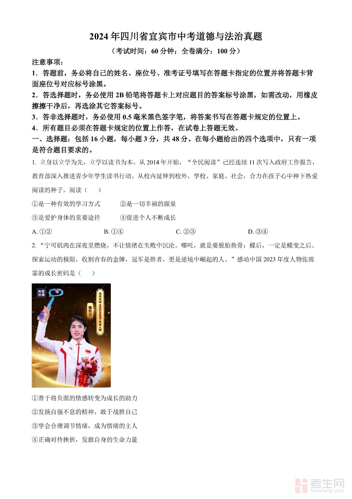 2024年四川省宜宾市中考道德与法治真题(原卷版)