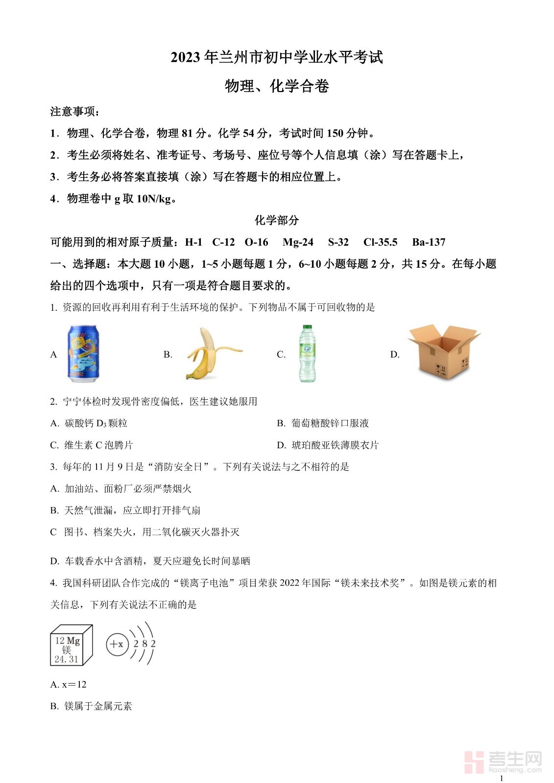 2023年甘肃省兰州市中考化学真题(原卷版)