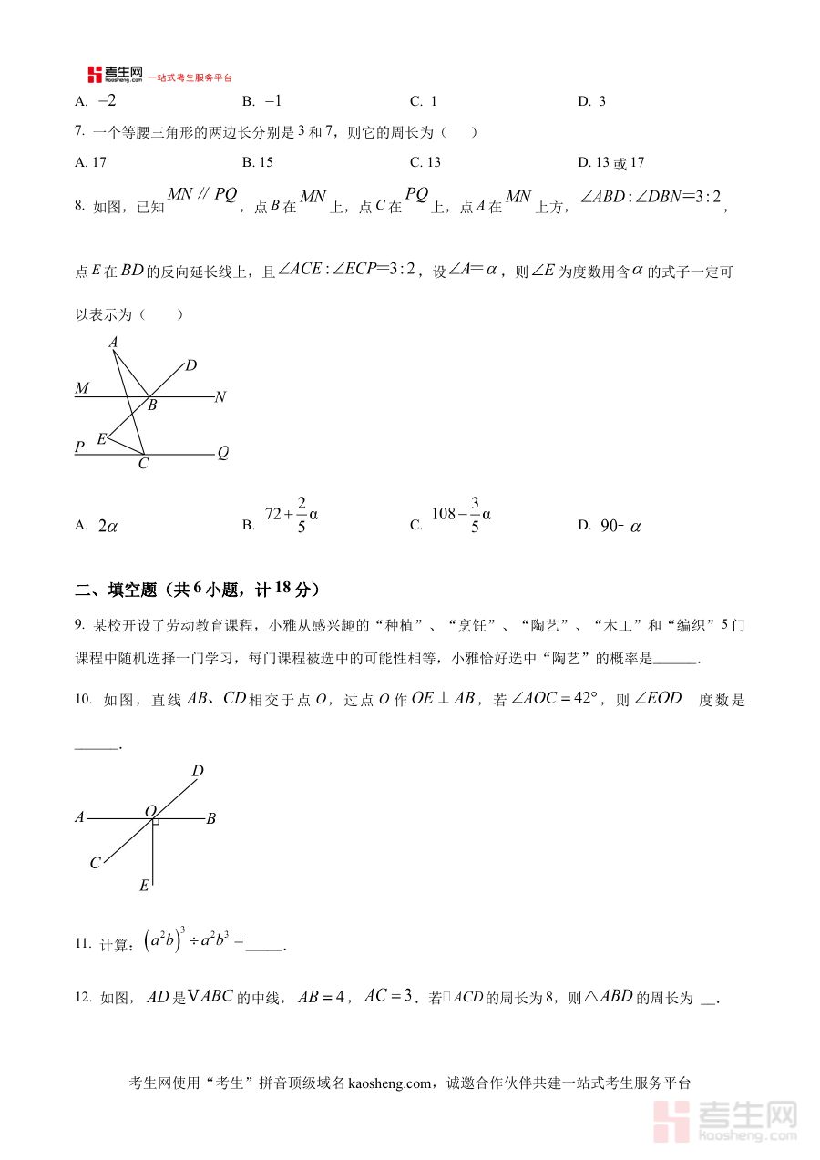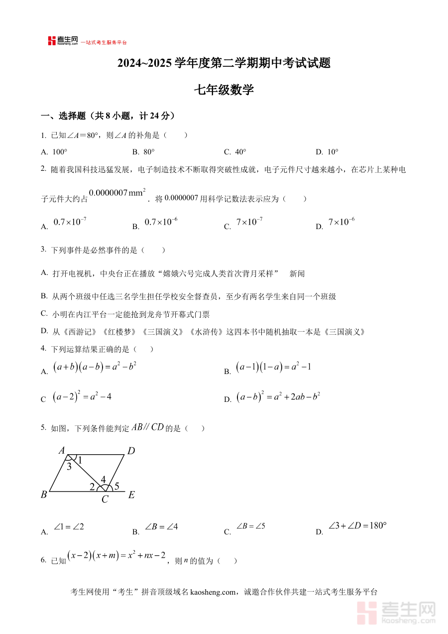 《精品解析:陕西省西安市高新一中2024-2025学年下学期期中考试七年级数学试题(原卷版)》是针对陕西省西安市高新一中2024至2025学年第二学期七年级数学期中考试设计的备考资料。该资料依托学校期中检测的命题方向与阶段学习重点,为学生提供了贴合校内教学进度与考试要求的原卷内容,能够帮助使用者直观了解本次期中考试的试卷结构与考查范围,是七年级学生应对该次考试的重要参考材料之一,同时也为教师和家长提供了与学校教学同步的检测依据。