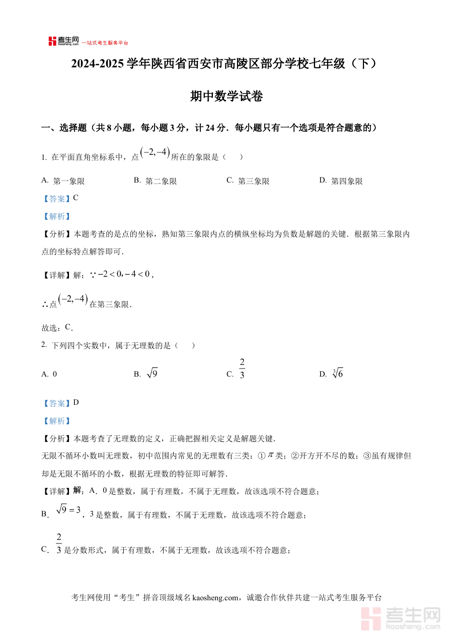 《精品解析:陕西省西安市高陵区部分学校2024-2025学年七年级下学期期中调研数学试题 -(解析版)》是针对陕西省西安市高陵区部分学校在2024-2025学年七年级下学期开展的期中调研数学考试所编制的专业备考资料。该资料聚焦于七年级下学期数学学科的期中阶段检测需求,结合当地学校的教学实际与调研考试的命题方向,为使用者提供了具有针对性的解析内容,帮助使用者更好地把握期中调研考试的核心要求与考查重点,是适配该地区学校期中复习阶段的重要学习资源。