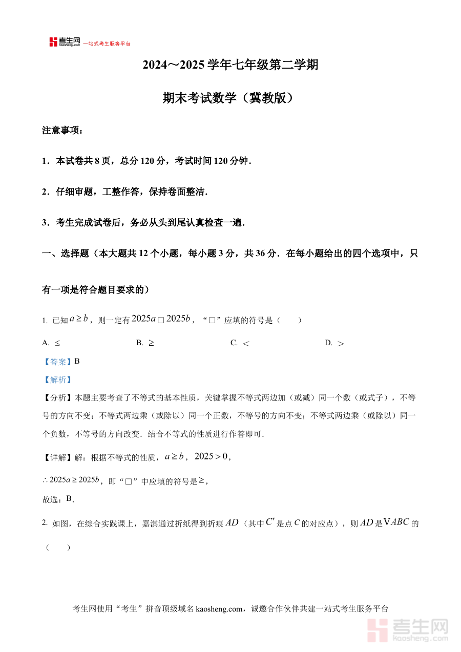 《精品解析:陕西省西安市长安区兴兴隆初级中学2024-2025学年下学期七年级期末考试数学试题(解析版)》是针对陕西省西安市长安区兴兴隆初级中学特定学年下学期七年级数学期末考试的专项备考资料。该资料聚焦于该校七年级学生在2024至2025学年下学期的数学期末考查场景,结合学校所在区域的教育教学实际与七年级数学学科的阶段性学习目标,为师生提供与本校期末考试紧密关联的解析内容。它依托具体的考试场景设计,旨在帮助学生提前熟悉本校期末考试的考查方向与核心要求,为后续的系统复习备考提供明确且具有针对性的参考依据。