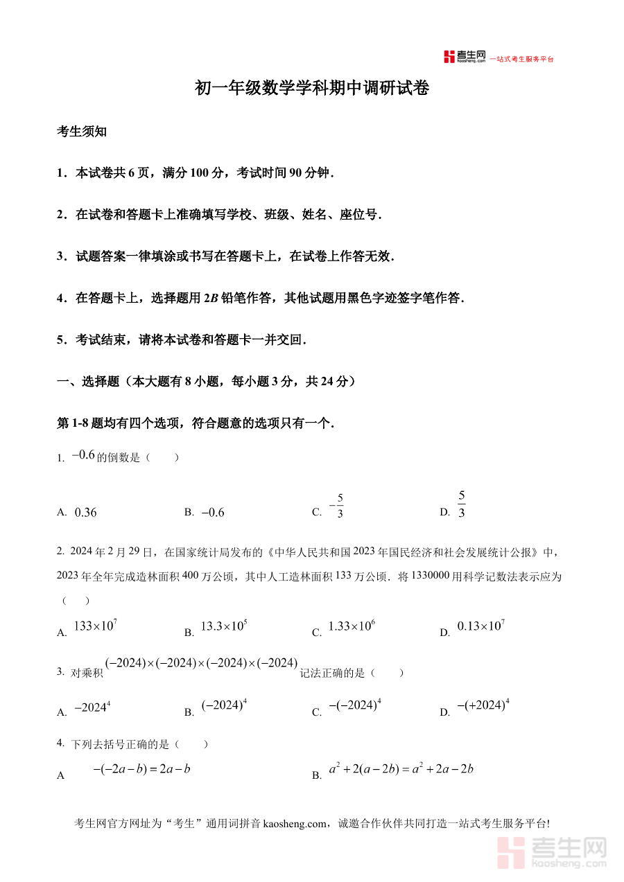 《精品解析:北京中学2024--2025学年上学期七年级期中考试数学试卷(原卷版)》是针对北京地区中学教育场景的阶段性考试资料,聚焦2024至2025学年第一学期七年级学生的数学学科期中考试需求。作为贴合北京中学教学进度的考试载体,该资料严格遵循本校该学期上半段的数学教学内容与考核标准,为师生提供了符合本地教学实际的考试参考范本,并以原卷形式呈现出期中考试的真实结构与考查方向,是期中考试前的核心备考资源之一。