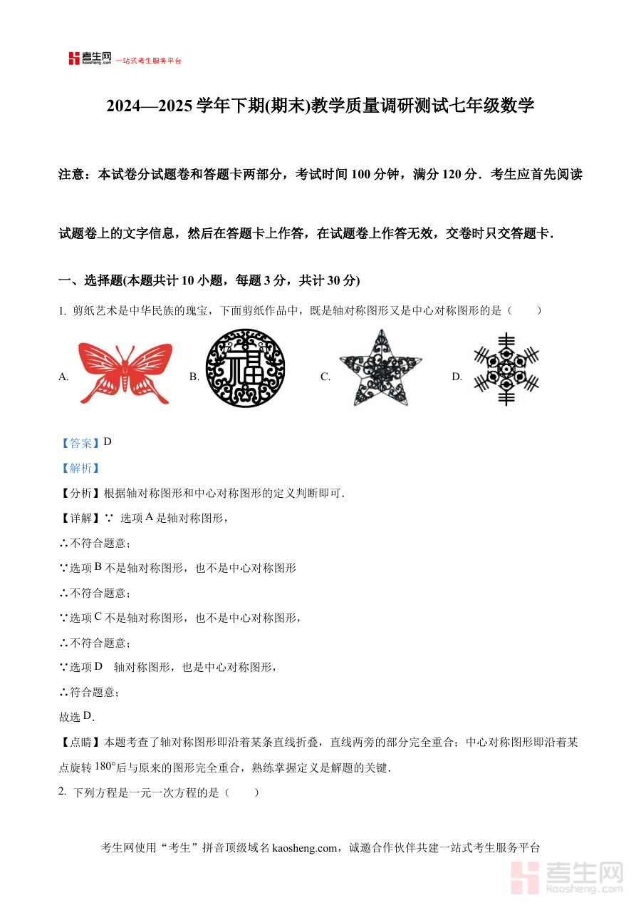 《精品解析:陕西省西安市雁塔区部分学校2024-2025学年七年级下学期期末联考数学试题(解析版)》是针对陕西省西安市雁塔区特定区域内部分学校联合组织的七年级下学期期末数学考试的专业解析类备考资料,其覆盖的考试时间节点为2024-2025学年下学期末,考试性质为区域性学校联考,旨在为参与该联考的学生及相关教学人员提供全面且深入的试题分析与解答指导服务。
