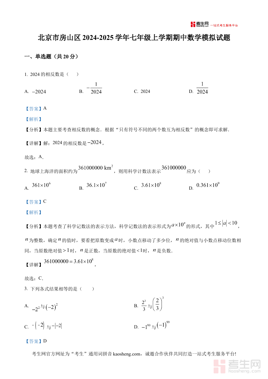 《精品解析:北京市房山区2024-2025学年七年级上学期期中数学模拟试题(解析版)》是针对北京市房山区2024至2025学年七年级上学期期中数学考试的专项备考资料,聚焦该地区该学段期中阶段的数学学习成果检验需求,为相关使用者提供贴合本地教学实际的模拟训练支持。