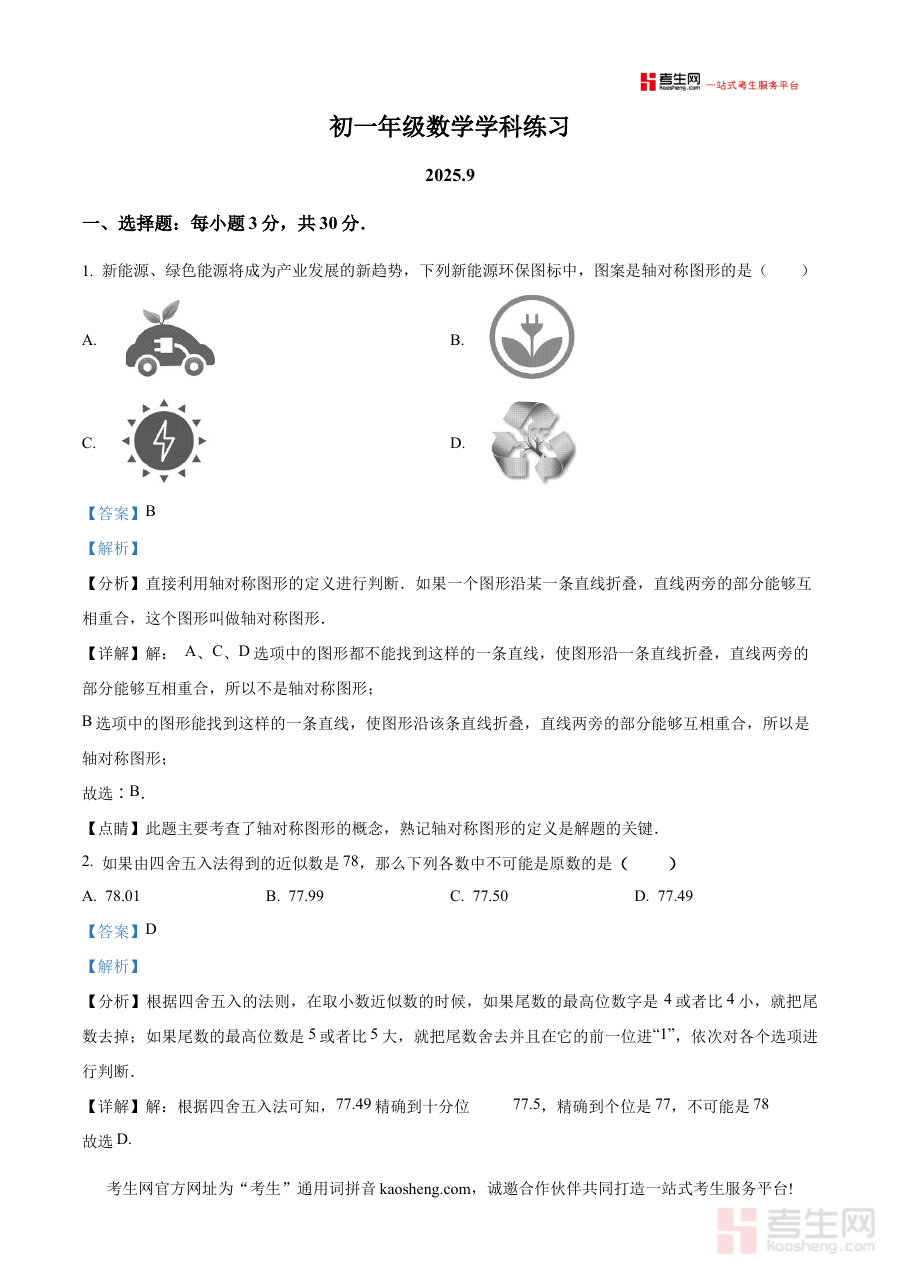 《精品解析:北京市中关村中学(双榆树校区)2025~2026学年上学期七年级月考数学试卷(9月)(解析版)》是针对北京市中关村中学双榆树校区2025至2026学年上学期七年级9月月考数学科目的备考资料,聚焦该阶段学校内部阶段性考试需求,为使用者提供贴合校区教学进度的针对性学习资源。