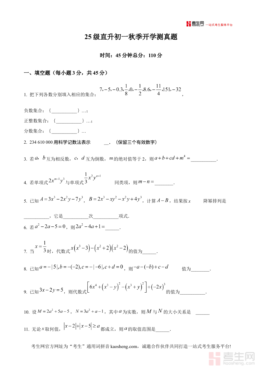《精品解析:北京市十一学校2025-2026学年上学期直七年级开学测数学试题(原卷版)》是针对北京市十一学校2025-2026学年上学期七年级开学测试的数学学科原卷资料,属于新学期起始阶段的重要备考资源,能够为使用者提供该考试的原始试卷呈现形式,为后续的复习准备与能力提升提供直接且可靠的参考依据。