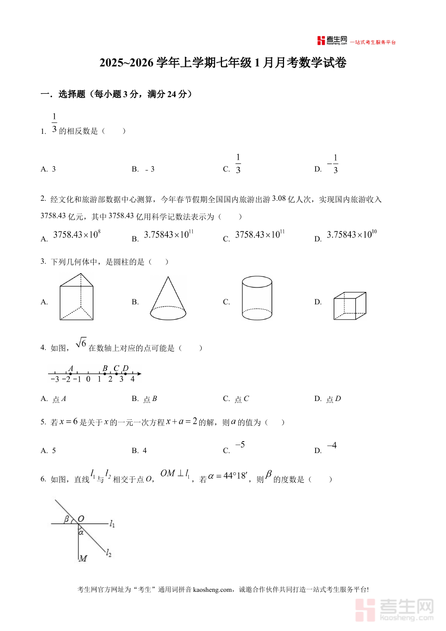 此试卷适用于北京市大峪中学2025-2026学年上学期的七年级学生及数学教师群体。作为1月学情自测的原卷版,它不仅能帮助学生进行阶段性学习成果的自我检验,为后续学习规划和备考准备提供清晰指引;还能助力教师精准把握学生学习动态,提升教学针对性和有效性,共同推动数学学科学习质量的提升。