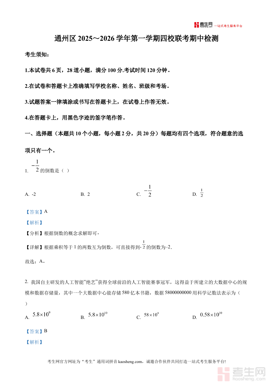 《精品解析:北京市通州区四校2025-2026学年七年级上学期联考期中数学试题(解析版)》是针对北京市通州区四所学校联合组织的2025-2026学年七年级上学期期中数学考试的专项备考资料。该资料聚焦区域联考场景,结合七年级上学期数学学科阶段性学习特点,为学生提供贴合本地教学实际的备考支持。