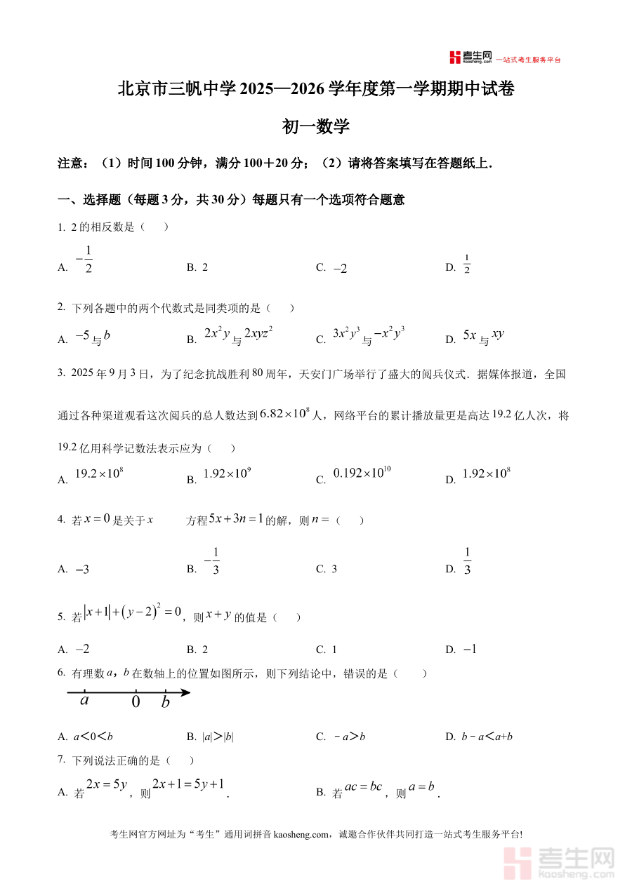 以《精品解析:北京市三帆中学2025-2026学年七年级上学期期中考试数学试卷(原卷版)》为核心的资料,精准对应北京市三帆中学特定学年七年级上学期的数学期中考试场景,是针对该阶段数学学科期中考试的专业备考资料。它依托学校官方考试资源,保留了原卷的完整结构与形式,为使用者提供与实际考试高度贴合的内容载体,帮助使用者提前熟悉考试的整体框架、时间安排与呈现形式。