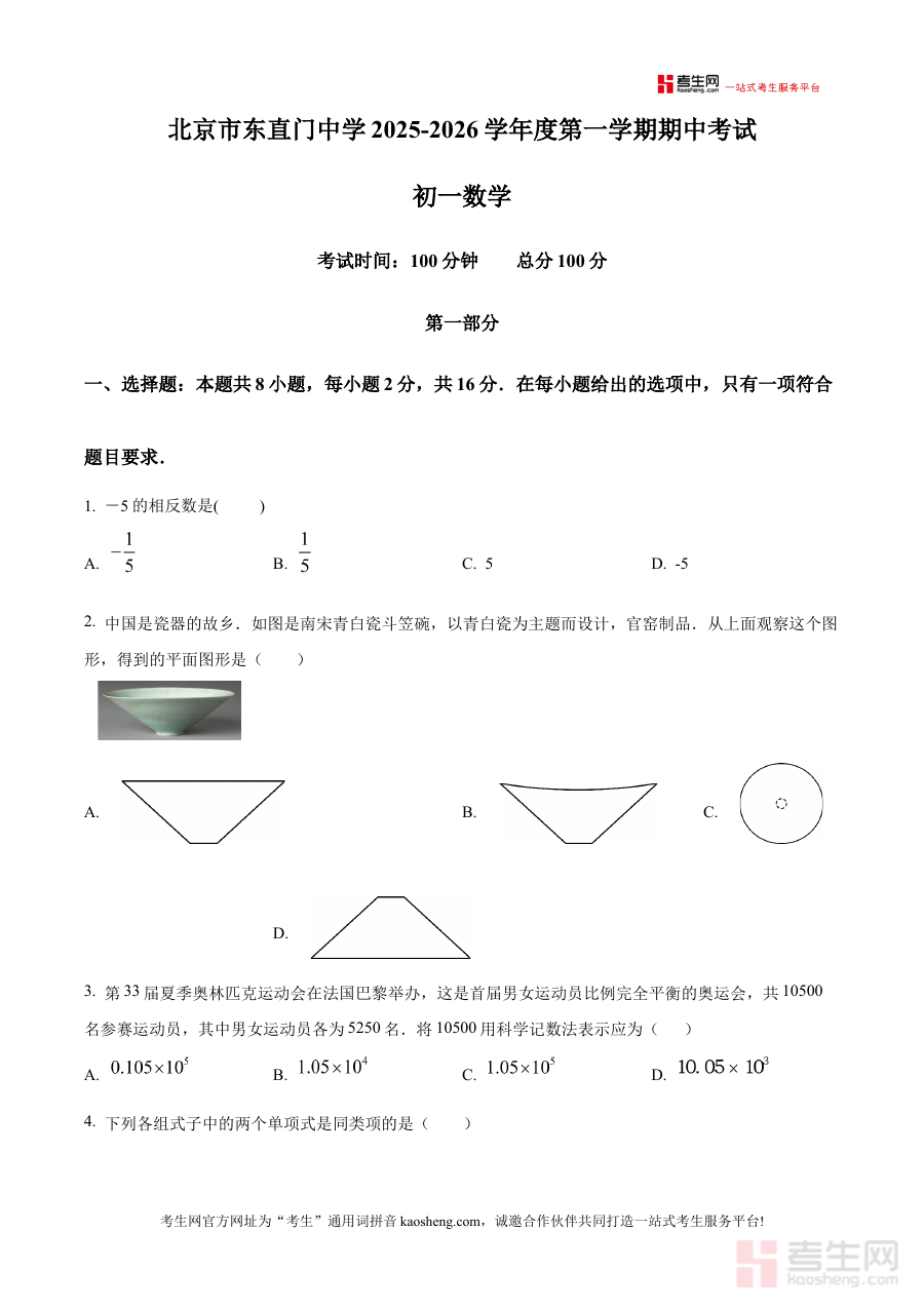《精品解析:北京市东直门中学2025-2026学年七年级上学期期中数学试卷(原卷版)》是北京市东直门中学针对2025-2026学年七年级上学期期中数学考试推出的原卷版备考资料,明确覆盖特定学年、年级、学期及考试类型,精准匹配该校七年级数学教学进度与期中检测要求,为使用者提供贴合实际教学场景的考试素材支撑。