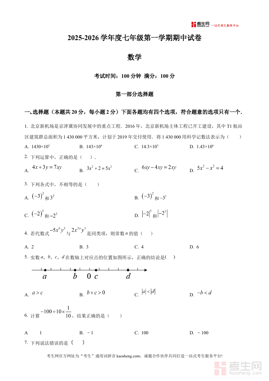 《精品解析:北京市京源学校2025-2026学年七年级上学期期中数学试卷(原卷版)》是针对北京市京源学校2025至2026学年七年级学生上学期期中数学考试的专属备考资料,紧密贴合该校该阶段数学教学进度与期中考核要求,为学生提供与校内考试高度匹配的练习资源。