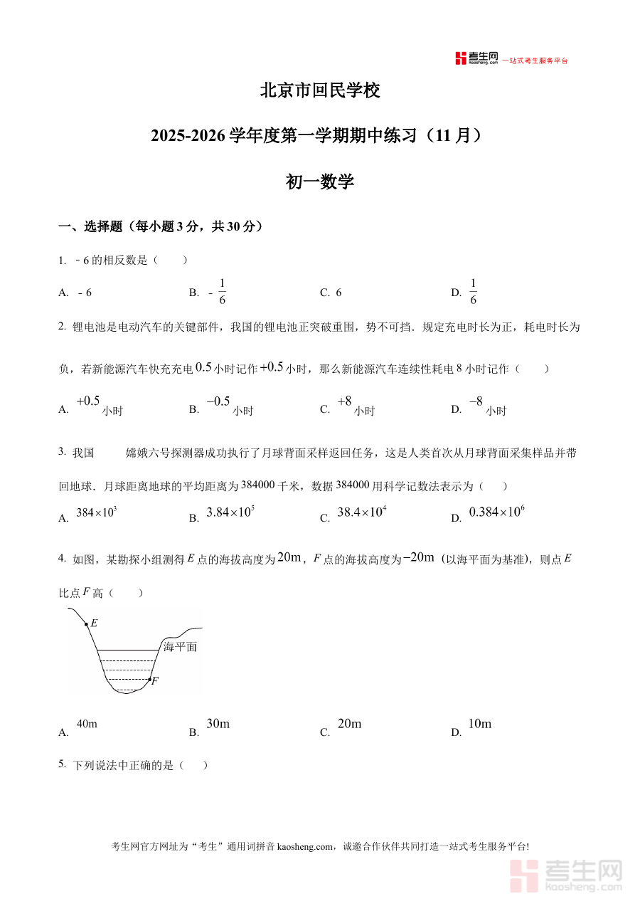 《精品解析:北京市回民学校2025-2026学年七年级上学期数学期中测试卷(原卷版)》是针对北京市回民学校2025-2026学年七年级上学期数学学科期中阶段考试的备考资料,精准契合该学校该学年七年级数学期中测试的考查范畴与阶段性学习要求。