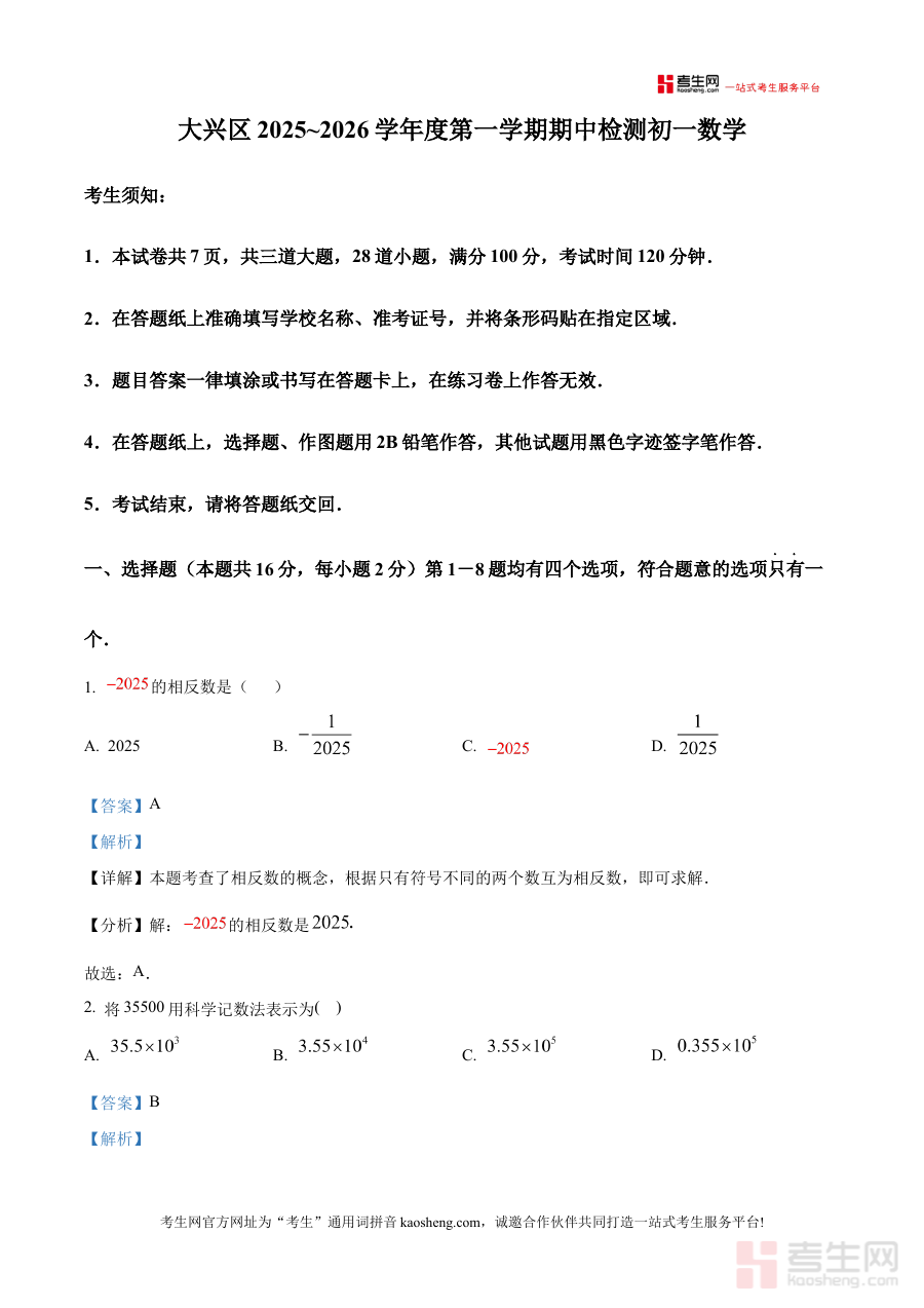 《精品解析:北京市大兴区2025-2026学年七年级上学期期中考试数学试题(解析版)》是针对北京市大兴区2025-2026学年七年级上学期数学期中考试的备考资料,聚焦该地区特定学年段的阶段性数学考试需求,为学生和教师提供与本地教学进度及考试标准匹配的参考内容。