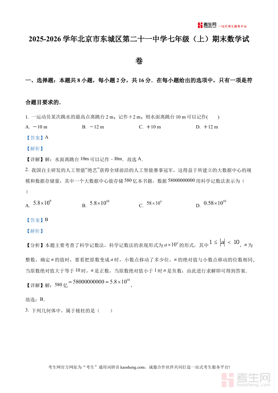 《精品解析:北京市东城区第二十一中学2025-2026学年上学期七年级期末数学模拟试卷(解析版)》是针对北京市东城区第二十一中学2025至2026学年上学期七年级期末数学考试的专项备考资料,结合该阶段数学学习进度与期末考核方向设计,为学生提供贴合校情与学情的模拟训练资源。