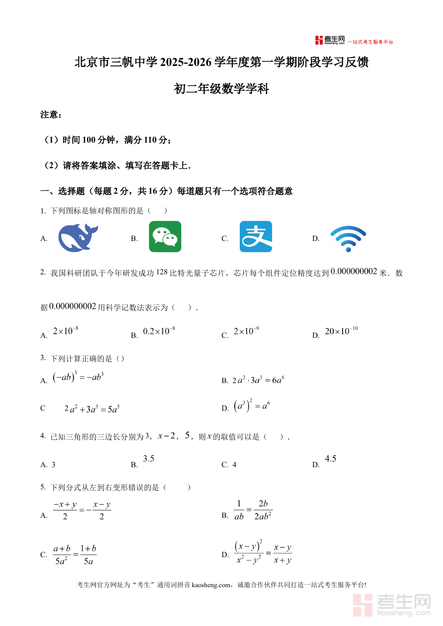 《精品解析:北京市三帆中学2025-2026学年八年级上学期12月月考数学试题(原卷版)》是北京市三帆中学针对2025-2026学年八年级上学期12月月考编制的数学试题原卷资料,属于该阶段数学学习的阶段性考试备考材料,能够为使用者提供该学校该时期数学月考的原始试卷形式,帮助使用者直观了解考试的呈现方式和基本框架,为后续的复习与备考奠定基础。