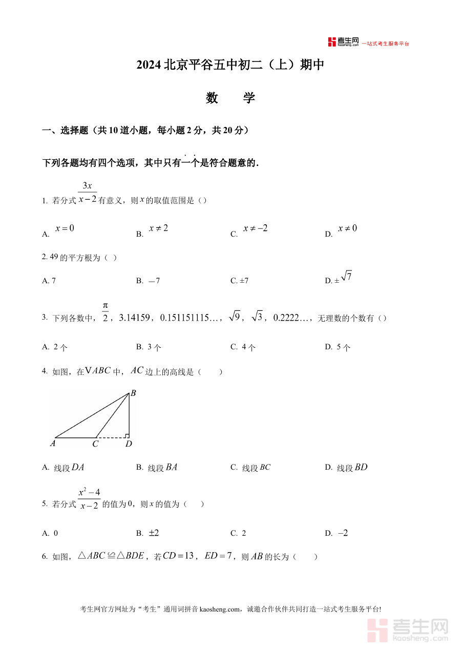 《精品解析:北京市平谷区第五中学2024-2025学年八年级上学期期中考试数学试卷(原卷版)》是针对北京市平谷区第五中学2024至2025学年八年级学生上学期期中考试的数学学科原卷资料,它依托该学年该阶段的数学教学进度与考试要求编制,能够精准反映该学校八年级上学期期中考试的命题方向与考查范围,为相关学生提供贴合本校实际考试情境的备考素材。