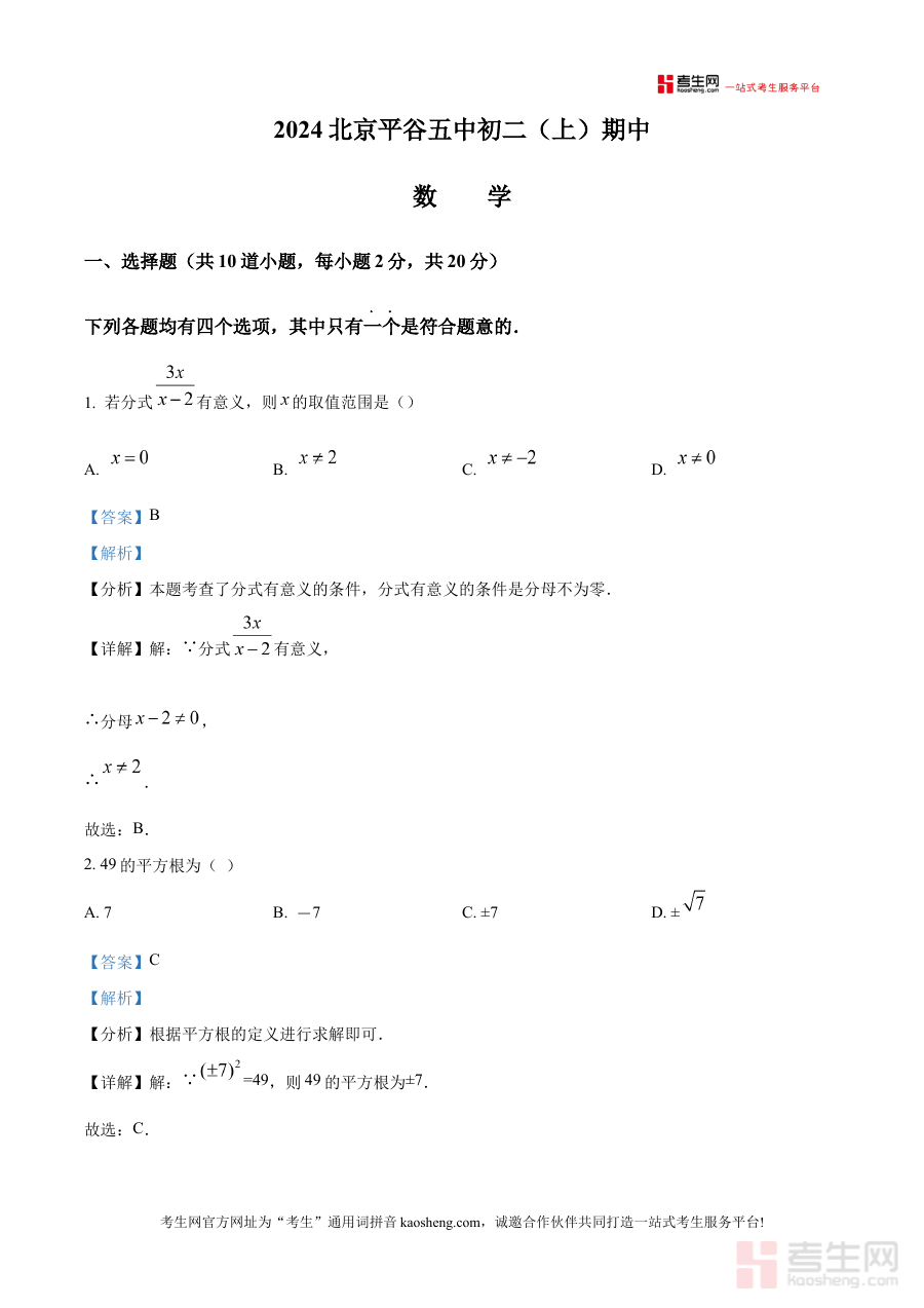 《精品解析:北京市平谷区第五中学2024-2025学年八年级上学期期中考试数学试卷(解析版)》是针对北京市平谷区第五中学2024至2025学年八年级上学期数学期中考试的专项备考资料,结合该学年该阶段的数学教学进度与校考要求编制,为学生提供贴合本地校考实际的学习参考依据。