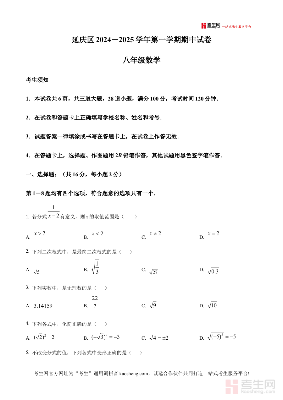 《精品解析:北京市延庆区2024--2025学年八年级上学期期中考试数学试卷(原卷版)》是针对北京市延庆区2024至2025学年八年级上学期数学期中考试的备考资料,精准匹配该地区该学年八年级上半学期的数学阶段性考查方向,以原卷形式呈现符合本地教学进度与考试要求的内容,为使用者提供贴近实际考试场景的备考载体。