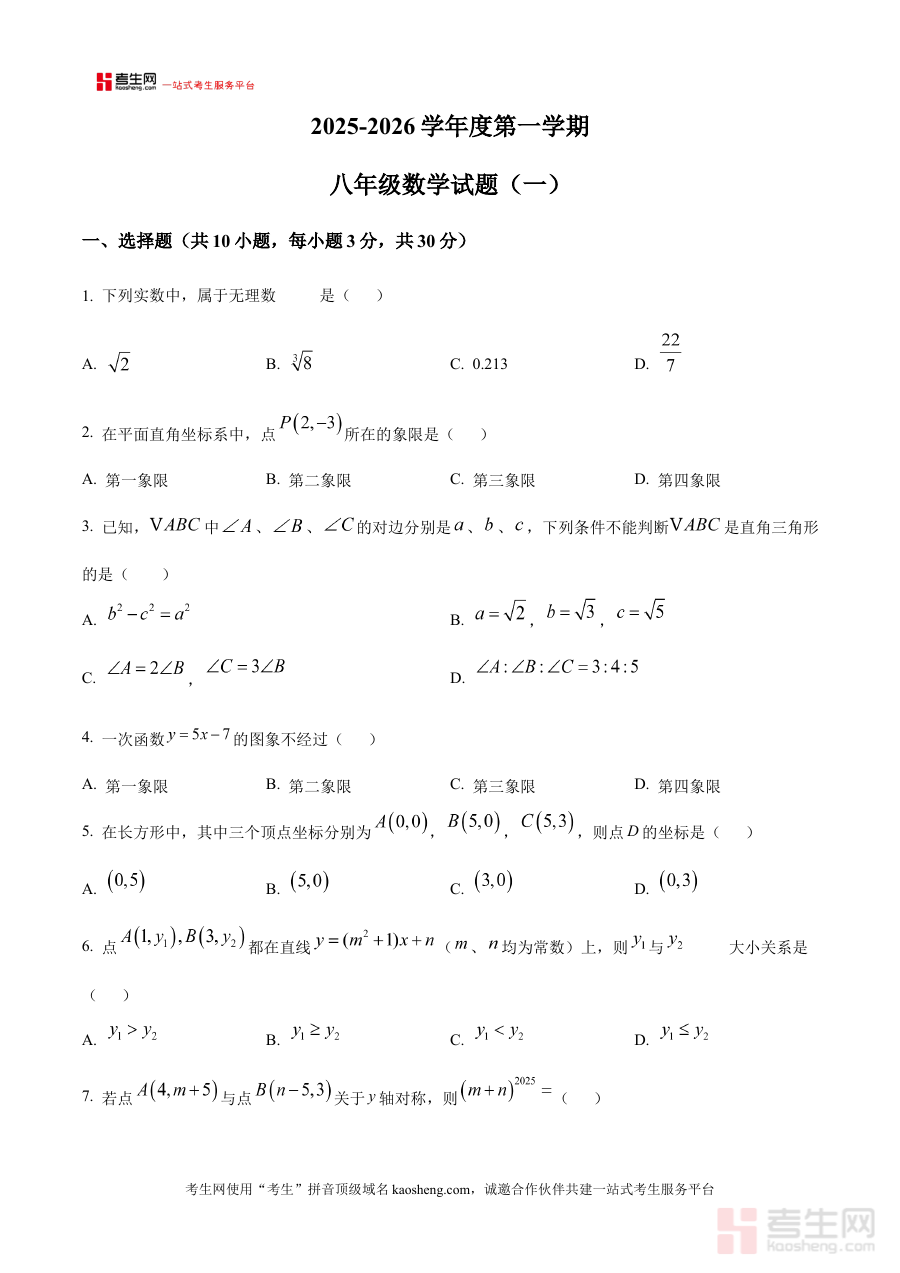 《精品解析:陕西省西安市西咸新区西安高新一中沣东中学初中校区2025-2026学年八年级上学期第一次月考数学试题(原卷版)》是针对陕西省西安市西咸新区西安高新一中沣东中学初中校区八年级学生,在2025-2026学年上学期第一次月考数学科目的官方原卷备考资料。该资料直接对应校区内部阶段性考试的具体要求,精准反映该校区八年级数学教学的阶段性重点与考查方向,为学生提供与实际考试完全一致的试卷形式与考查情境,是备考该次月考不可或缺的核心资料之一,能够帮助使用者快速对接校区考试标准。