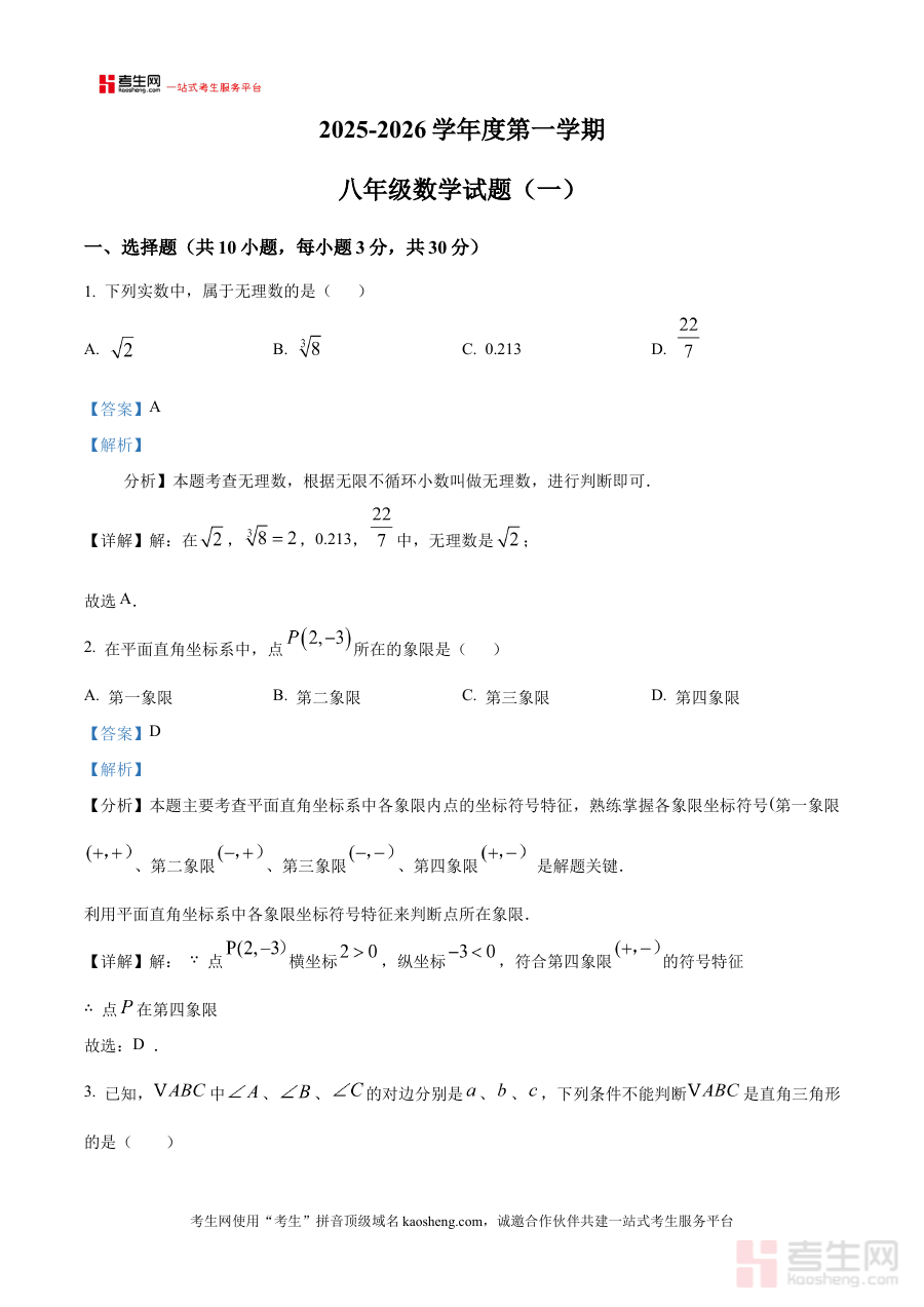 《精品解析:陕西省西安市西咸新区西安高新一中沣东中学初中校区2025-2026学年八年级上学期第一次月考数学试题(解析版)》是针对陕西省西安市西咸新区西安高新一中沣东中学初中校区特定学年段的阶段性数学考试配套资料,精准对应该校区2025-2026学年八年级上学期第一次月考的数学学科考查内容,作为带有详细解析的版本,为相关师生提供了与本次月考直接匹配的备考资源支持,有助于使用者快速把握该次月考的考查重点与方向,为后续的复习与准备奠定基础。