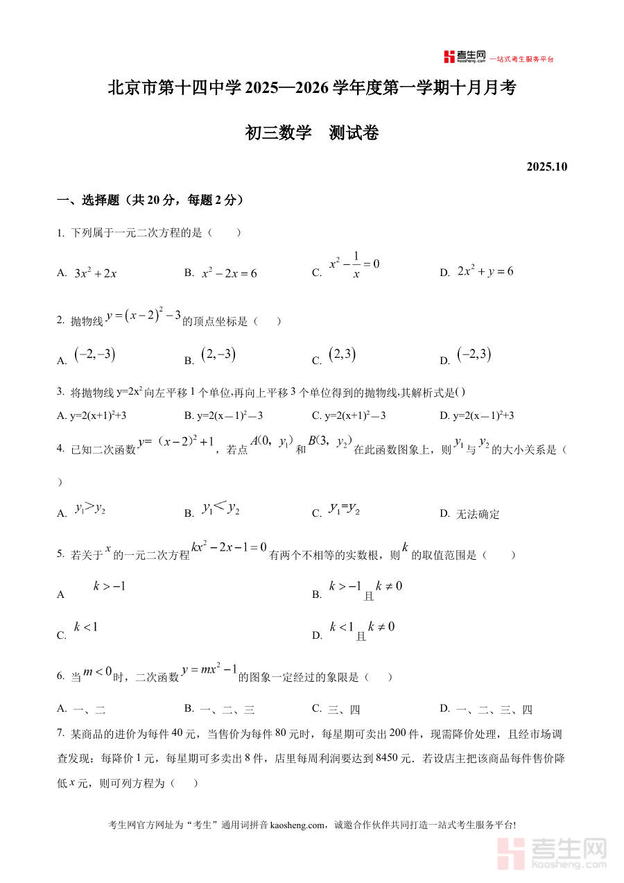 《精品解析:北京市第十四中学2025-2026学年八年级上学期10月月考数学试卷(原卷版)》是针对北京市第十四中学特定学年、特定年级与学期的阶段性数学考试资料,聚焦2025-2026学年八年级上学期10月的月考场景,精准贴合该校该阶段的教学进度与考试要求,完整呈现了此次月考的原卷内容,为学生和教师提供了与实际考试场景高度匹配的参考载体。