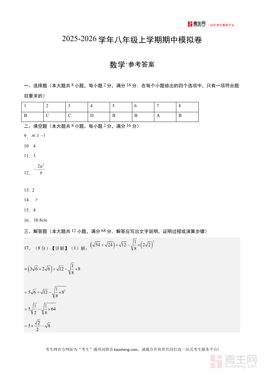 《八年级数学上学期期中模拟卷02(新教材北京版)(参考答案)》是针对北京地区使用新教材的八年级学生设计的数学上学期期中模拟卷配套参考资料属于期中备考阶段的重要辅助材料能够为学生和教师提供该模拟卷的标准解答参考帮助明确期中考点对应的正确解题方向和思路