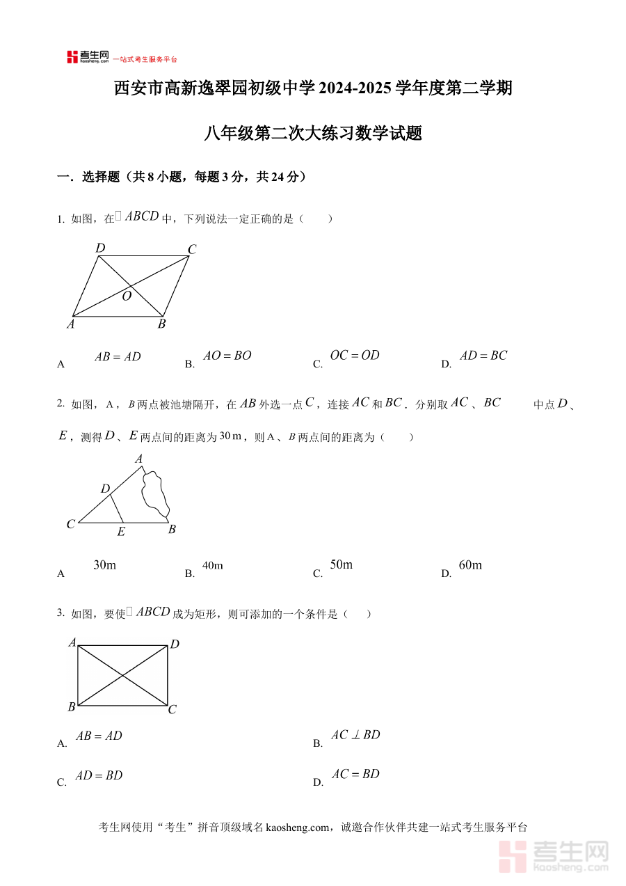 《精品解析:陕西省西安市高新逸翠园初级中学2024-2025学年 八年级下学期第二次月考数学试题(原卷版)》是针对陕西省西安市高新逸翠园初级中学特定学年段与考试节点的数学学科备考资料,其对应的时间范围为2024-2025学年八年级下学期,考试类型为第二次月考。该资料作为原卷版呈现,能够完整还原本次月考的试题原貌,为使用者提供与实际考试一致的试题载体,便于提前熟悉考试的整体框架与形式,是贴合该校八年级学生数学学习进度的阶段性资料。