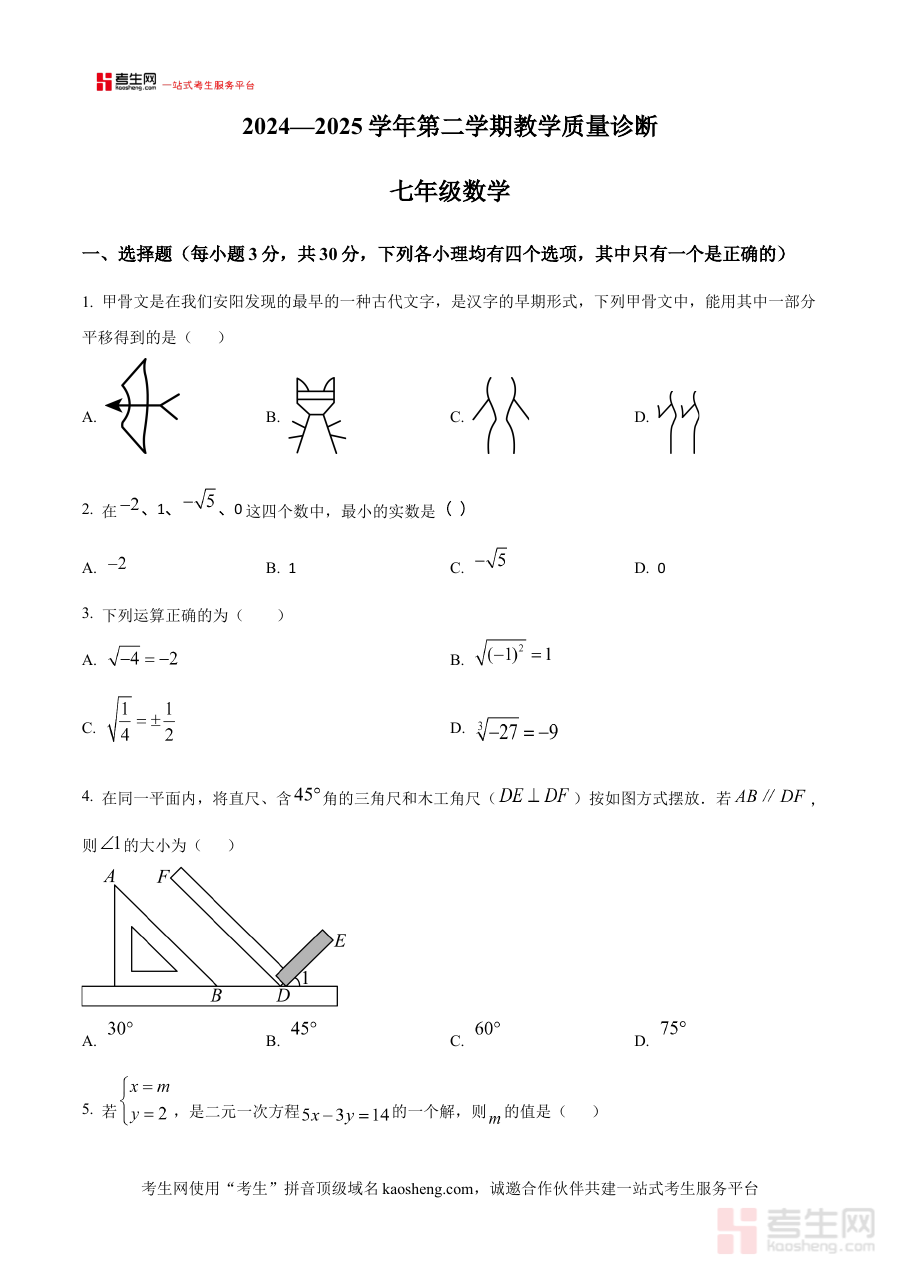 《精品解析:河南省郑州市第八中学2024-2025学年下学期七年级数学期中试卷(原卷版)》是针对2024-2025学年下学期河南省郑州市第八中学七年级数学期中考试的官方原卷形式备考资料。该资料严格遵循该校期中数学考试的命题规范,完整呈现了本次期中考试的试卷结构与命题方向,为学生提供了与实际考试高度一致的练习载体,帮助学生提前感知考试氛围与题型设置,是贴合该校七年级学生期中备考需求的重要资源。