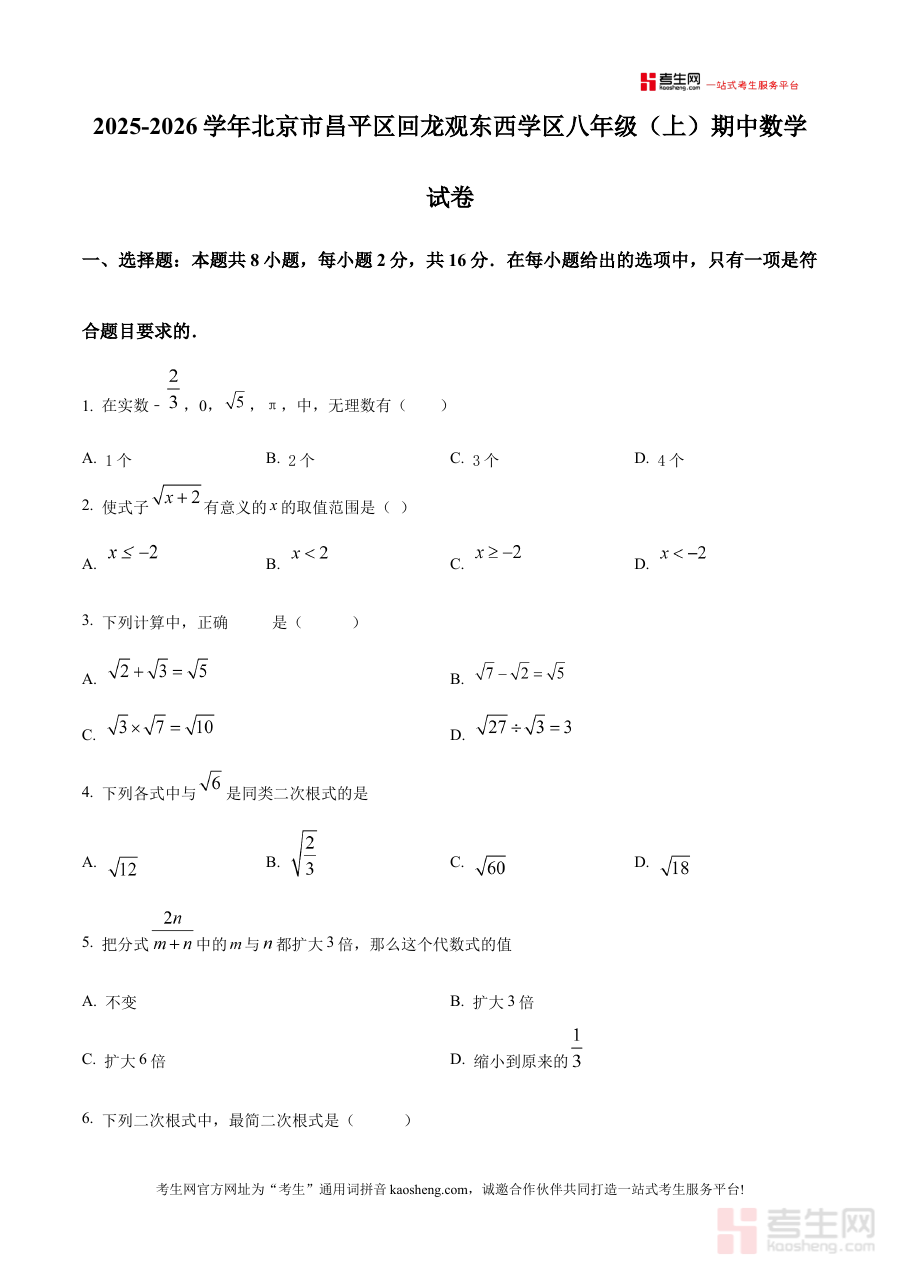 《精品解析:北京市昌平区回龙观东西学区2025-2026学年八年级上学期期中数学试卷(原卷版)》是针对北京市昌平区回龙观东西学区特定学年段的期中数学考试所编制的备考资料,其年份范围明确指向2025至2026学年,考试阶段为八年级上学期,属于该学区内阶段性数学学科检测的原始试卷版本,能够精准匹配该学区八年级学生的期中复习需求。