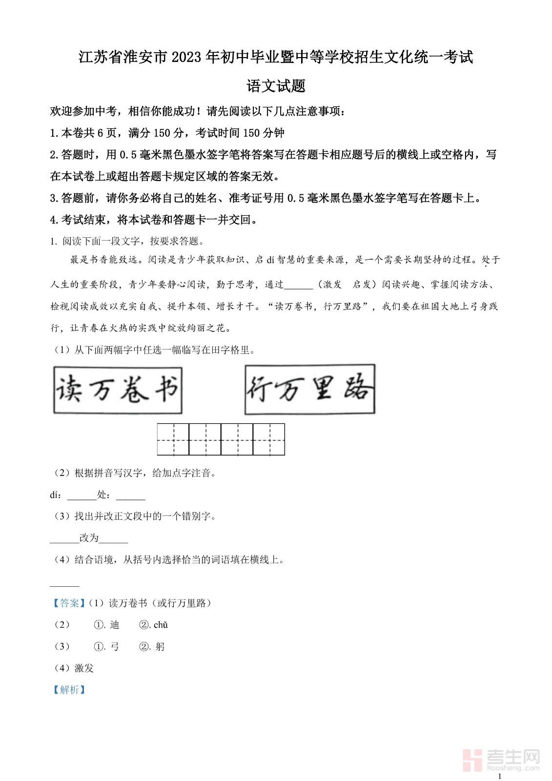 2023年江苏省淮安市中考语文真题(解析版)