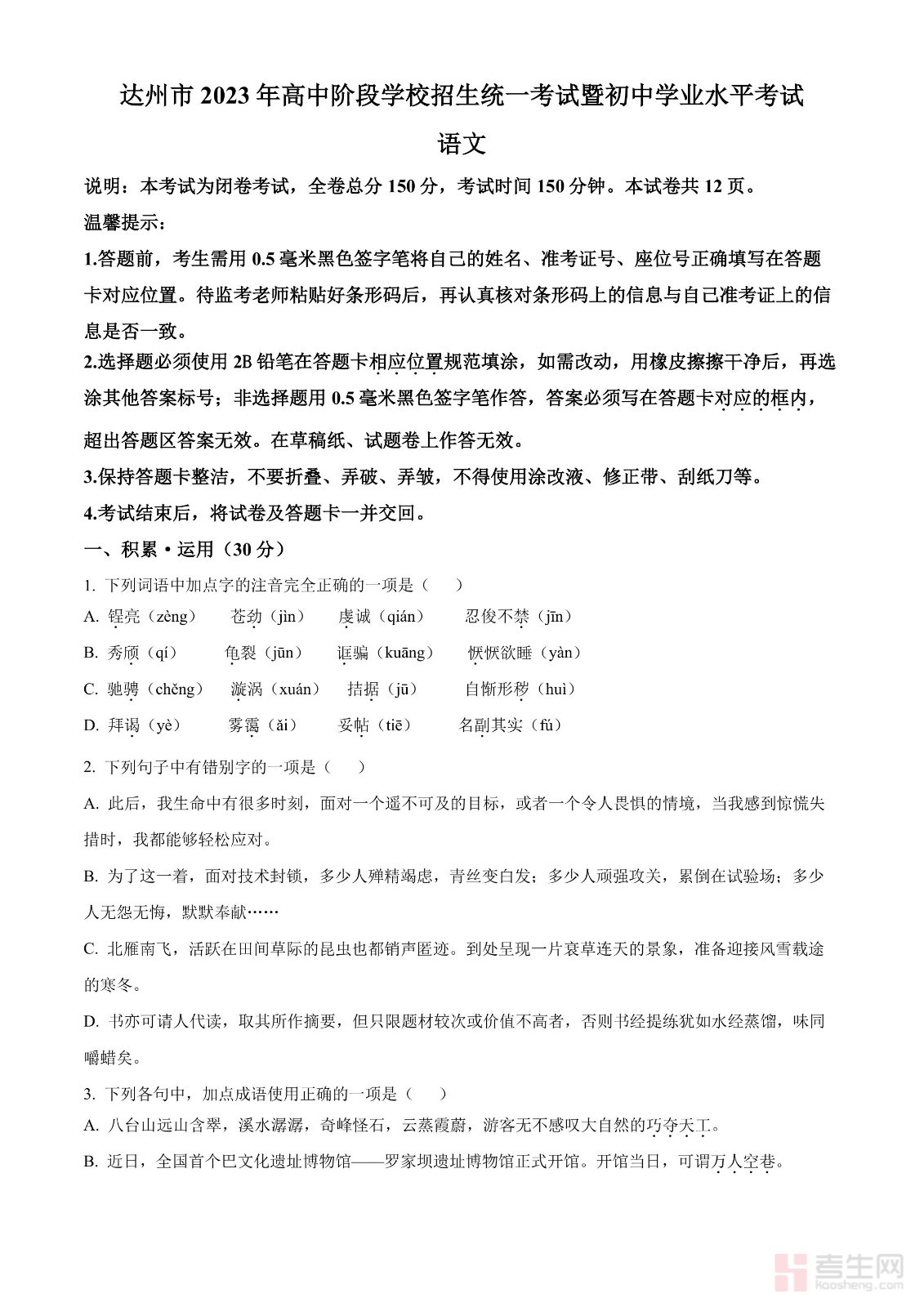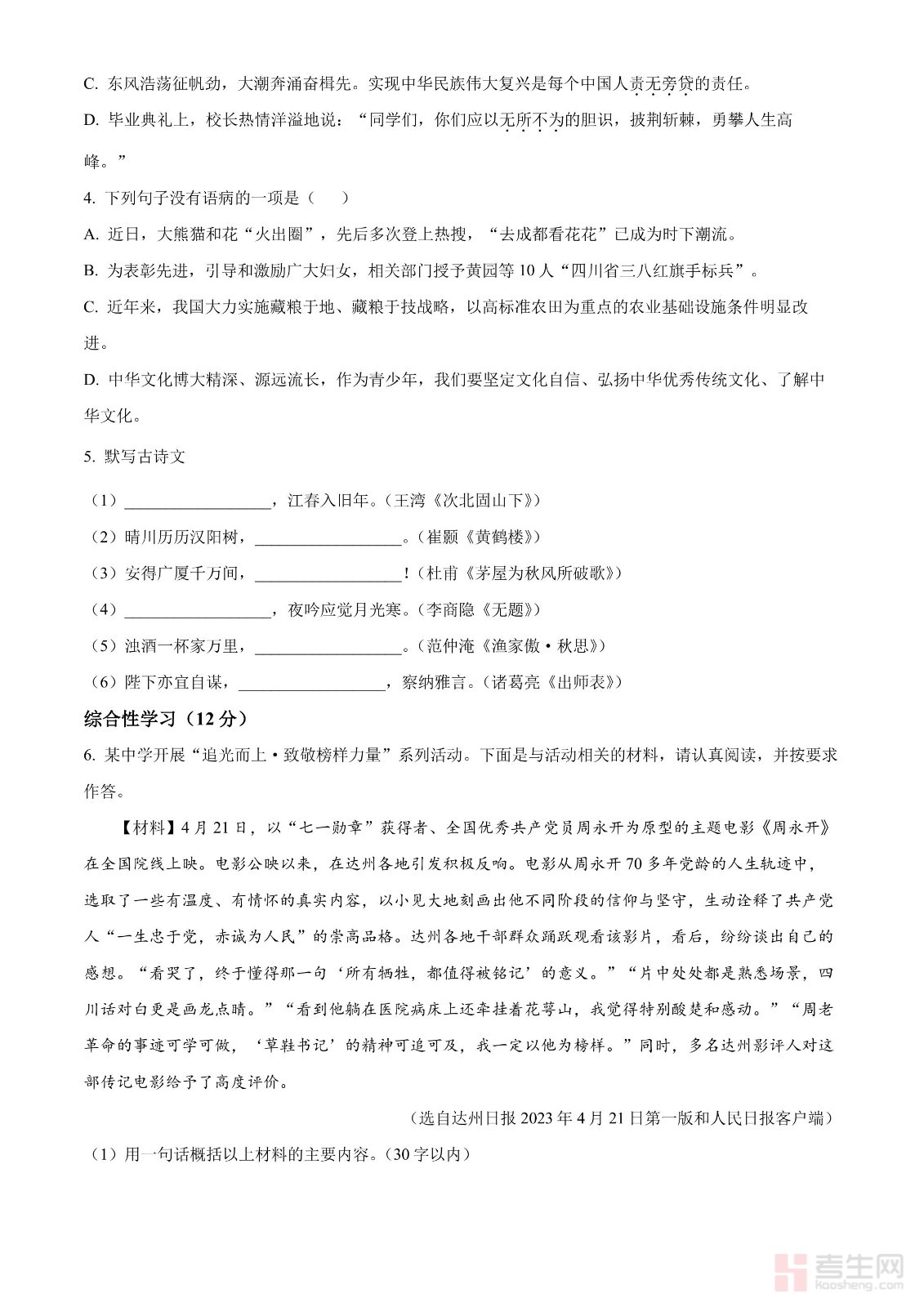 2023年四川省达州市中考语文真题(原卷版)