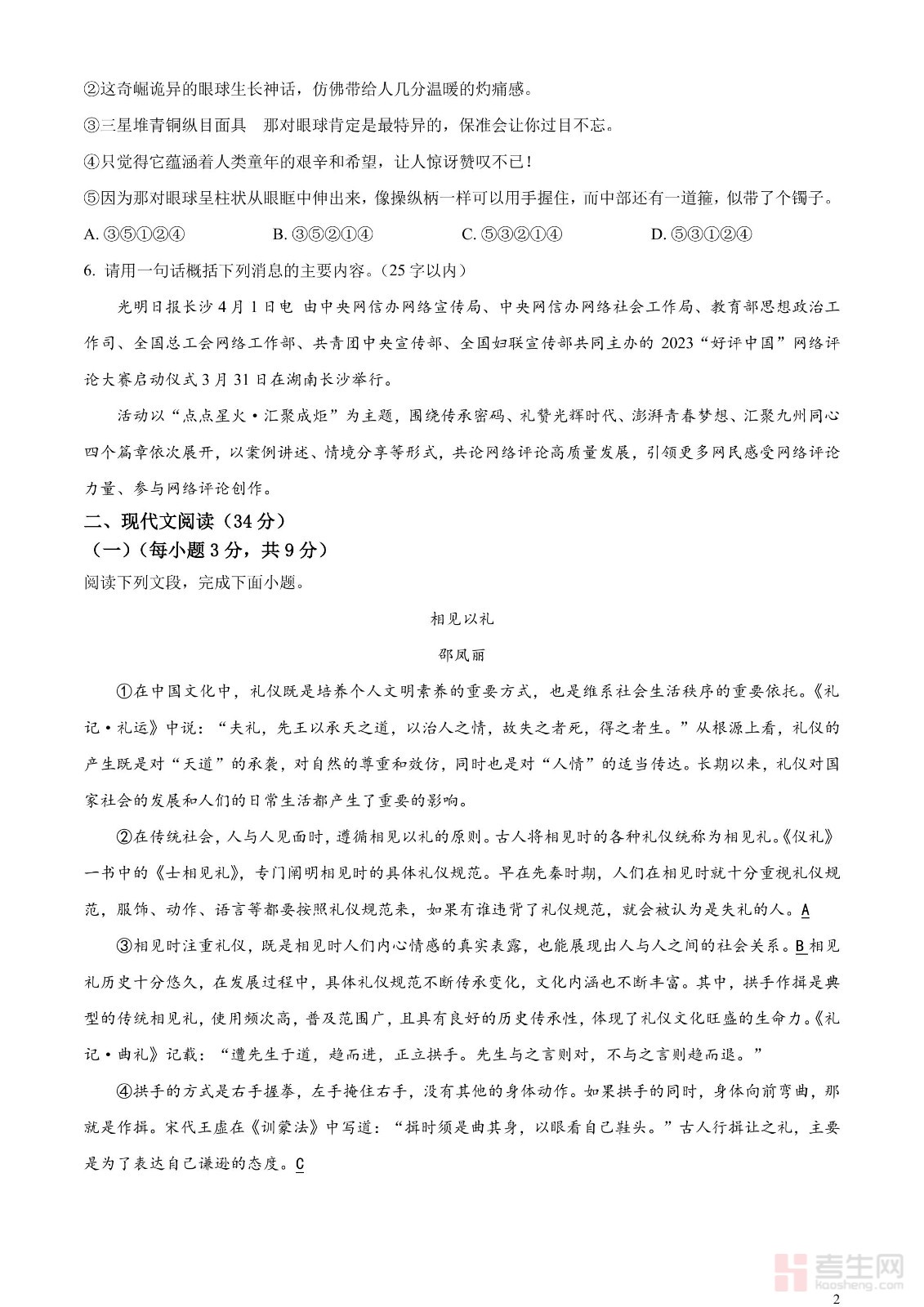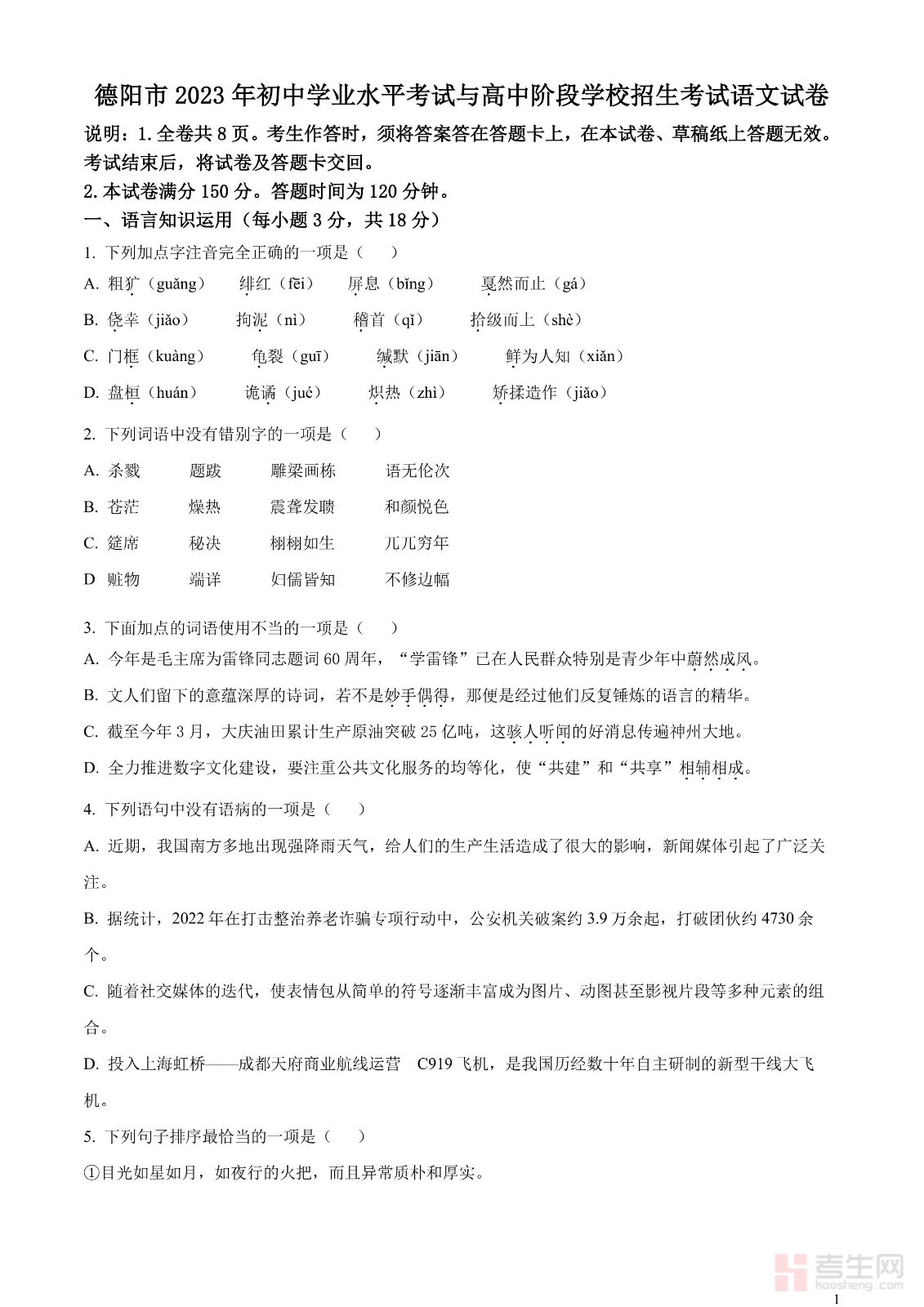 2023年四川省德阳市中考语文真题(原卷版)
