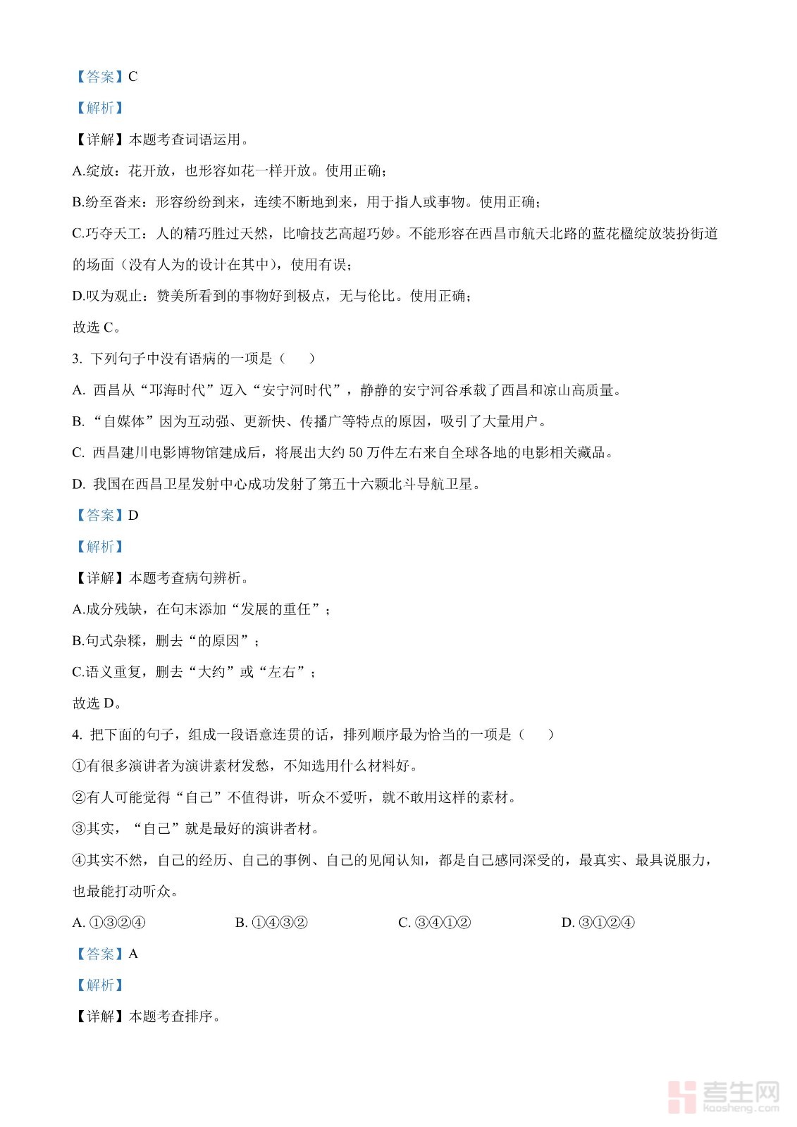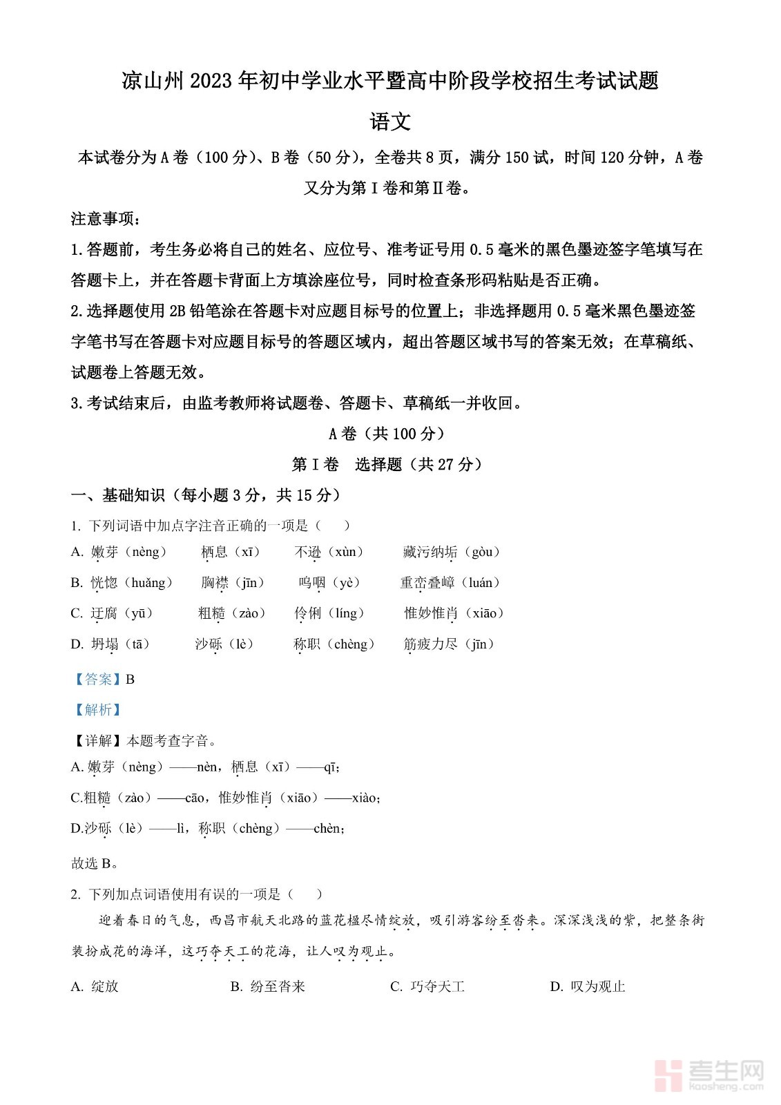 2023年四川省凉山彝族自治州中考语文真题(解析版)
