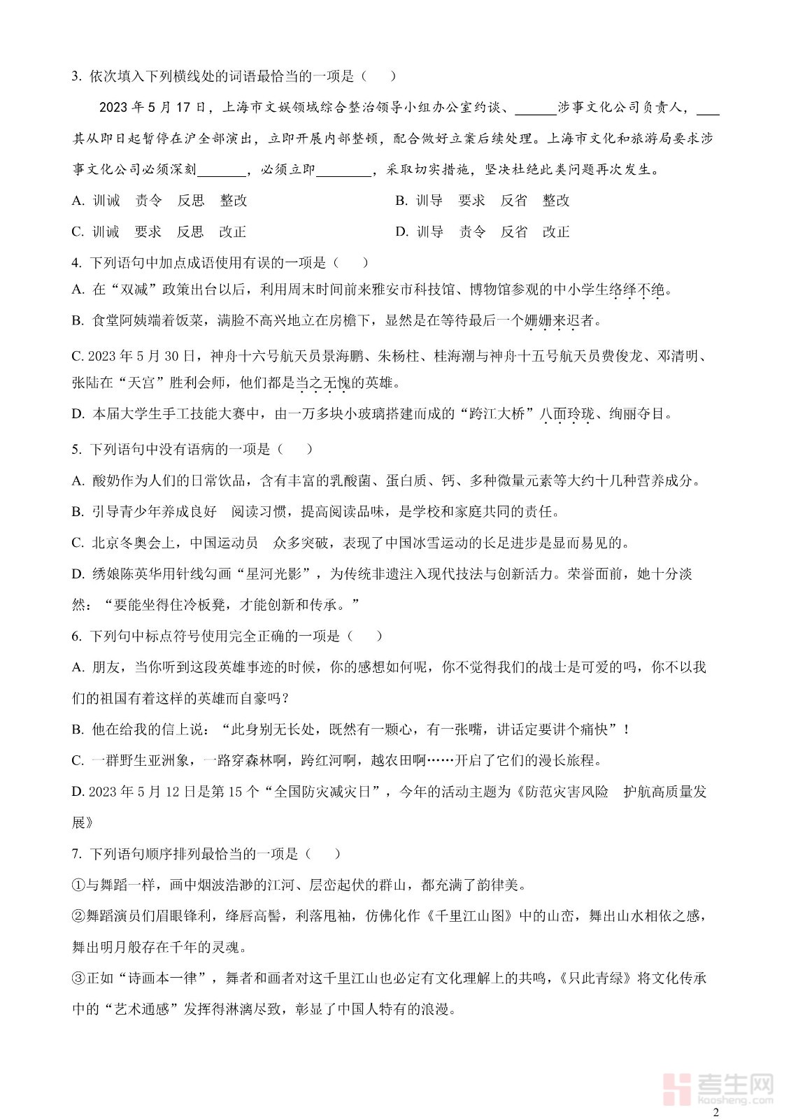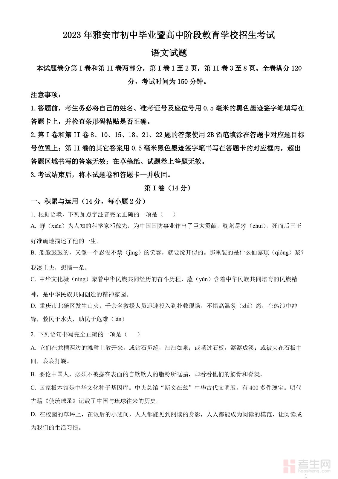 2023年四川省雅安市中考语文真题(原卷版)