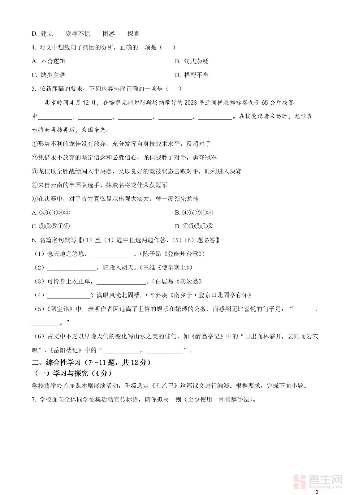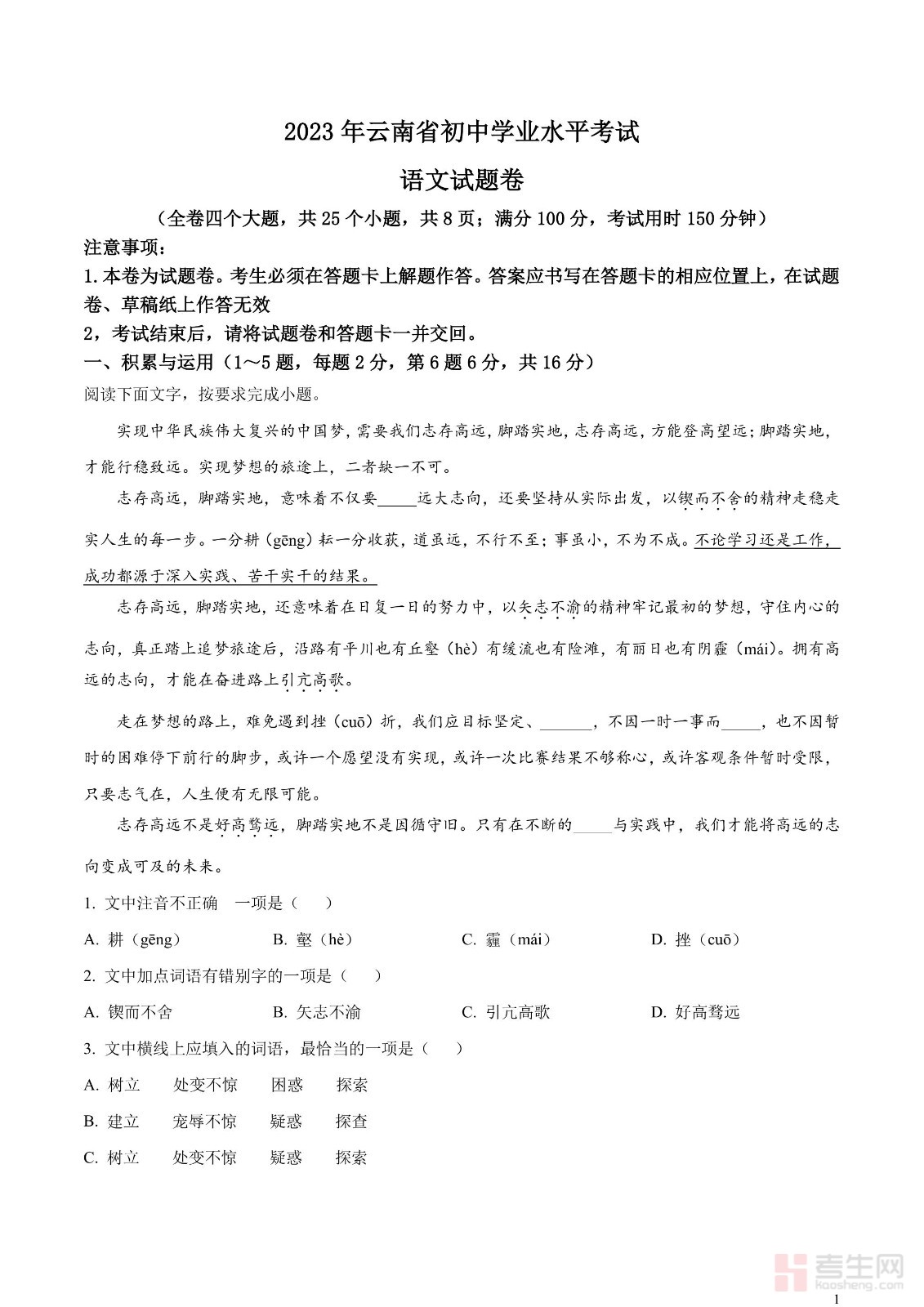 2023年云南省中考语文真题(原卷版)