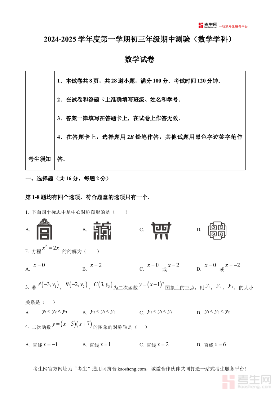 本资料主要面向北京市第四中学2024--2025学年上学期的九年级学生,同时也可为同区域同年级的其他学生提供期中数学备考的有效参考,其原卷版特性能够切实支撑学生进行阶段检测练习,对增强备考的针对性和规划的合理性具有重要价值。