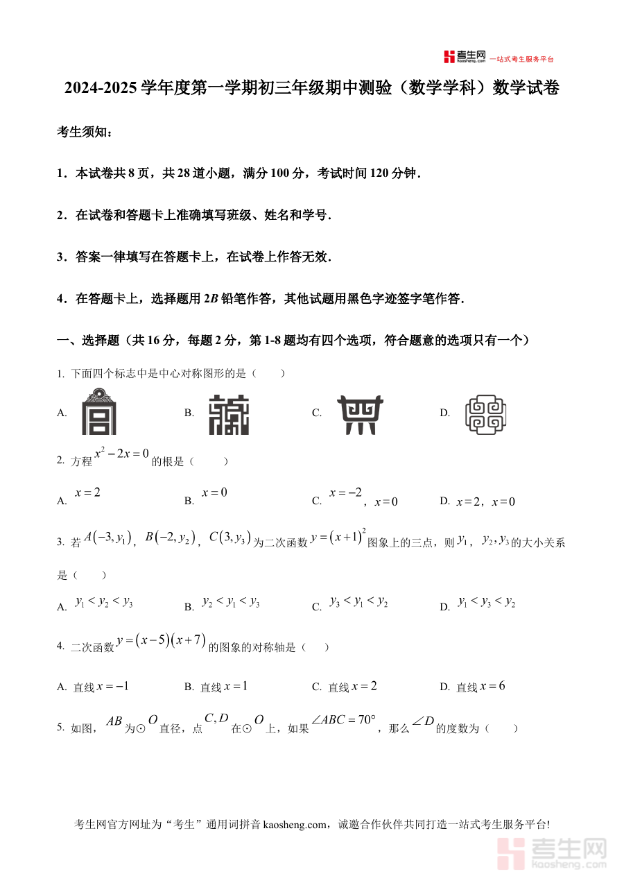《精品解析:北京市第四中学2024~2025学年上学期九年级期中考试数学试卷(原卷版)》是依托北京市第四中学教学资源与期中命题特点,针对2024至2025学年第一学期九年级数学期中考试设计的专业备考资料。其明确标注的年份跨度与学期信息精准对应该阶段学生的学习进程;地区限定为北京市,考试类型聚焦九年级上学期期中数学考试,能为相关师生提供贴合实际需求的备考支持。