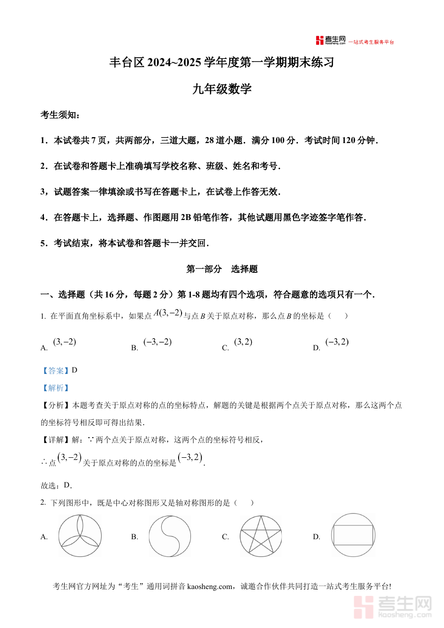 《精品解析:北京市丰台区2024—2025学年九年级上学期期末考试数学试卷(解析版)》是北京市丰台区针对2024至2025学年九年级上学期数学学科期末评价的配套解析类资料,紧密贴合该区域九年级数学教学的阶段性要求,集中体现了本地期末考查的方向与评价标准,为相关使用者提供了具有区域针对性的数学备考支持。